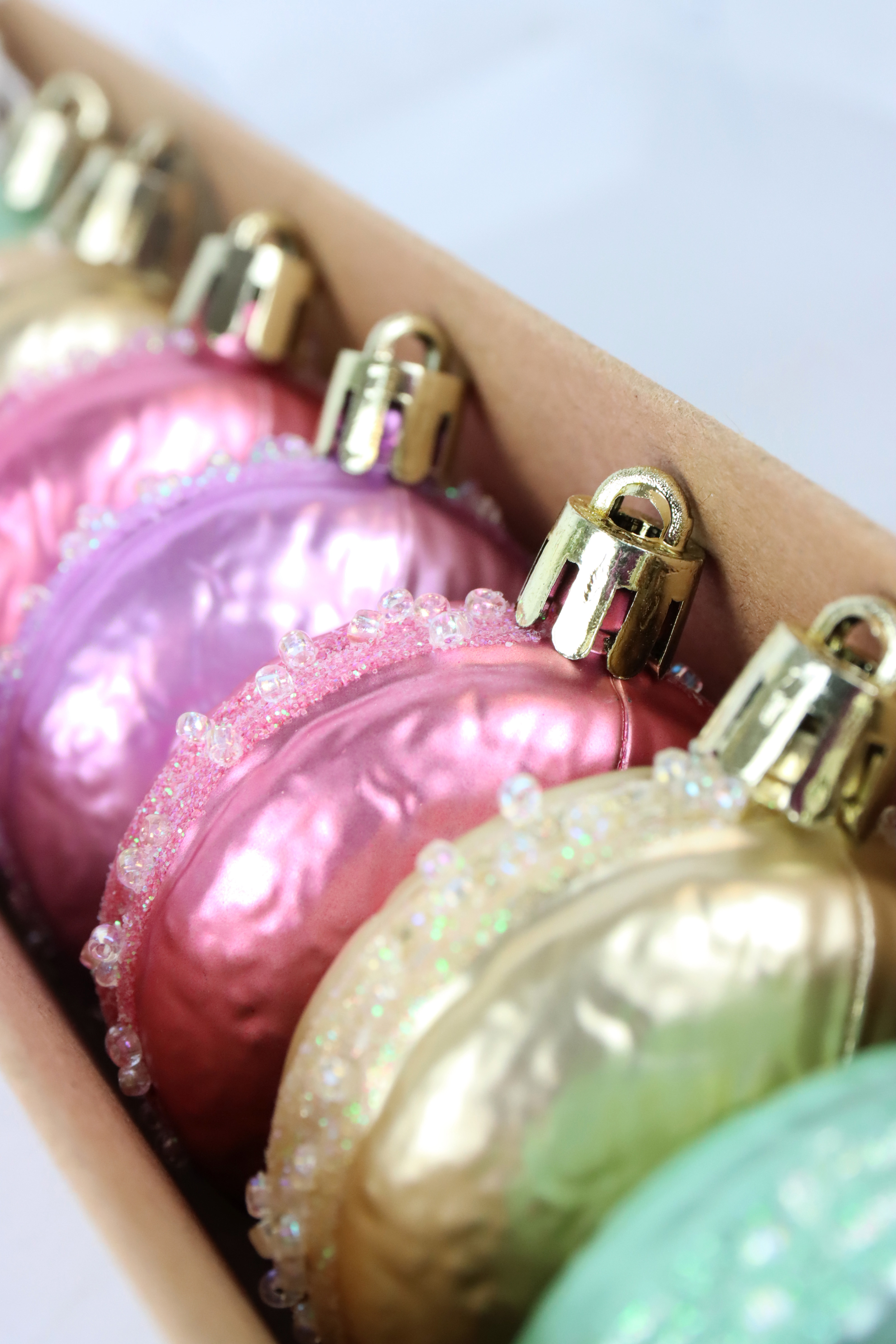 Unsere Zierhänger "Macaron" kommen in einem 9 teiligen Set und sind aus hochwertigem Kunststoff gefertigt. Mit einem Durchmesser von etwa 5cm weisen sie die ideale Größe auf, um den Weihnachtsbaum in ein Meer aus Farben und Lichter zu verwandeln, ohne zu aufdringlich zu wirken.