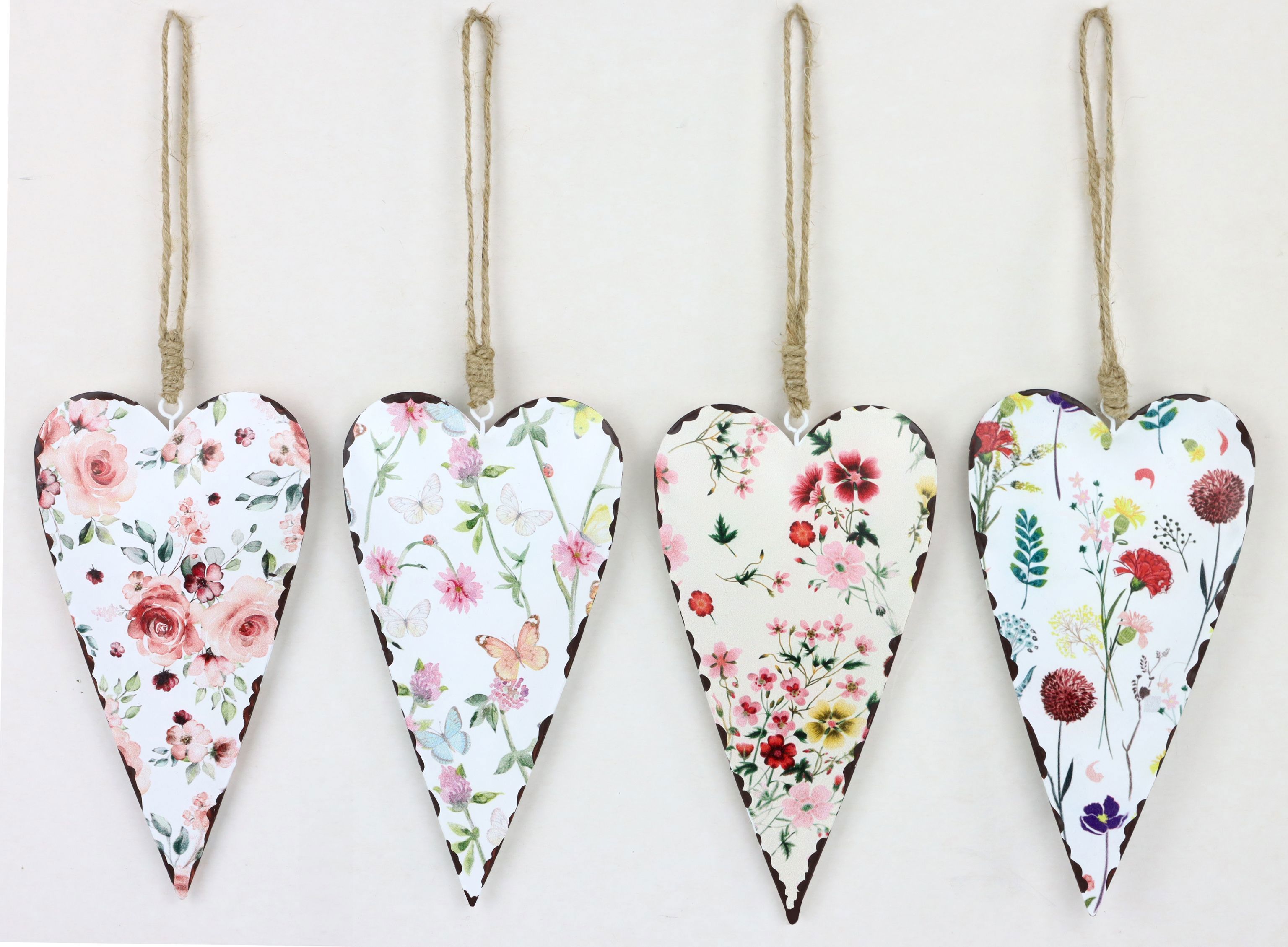 Das Set besteht aus vier kunstvoll gefertigten Herzen, jedes mit einem individuellen Blumenwiesenmotiv, die alle Maßstäbe in Sachen Deko-Charme und Vielseitigkeit übertreffen. Dank der robusten Verarbeitung aus hochwertigem Metall und einer Größe von ca. 18 cm sind die Zierherzen nicht nur besonders langlebig, sondern auch leicht zu handhaben und in jede Dekoration zu integrieren. Ob hängend an einer Tür oder Wand, als originelles Highlight in floralen Arrangements oder als zentrale Dekoelemente bei Feierlichkeiten - die Einsatzmöglichkeiten sind nahezu grenzenlos.