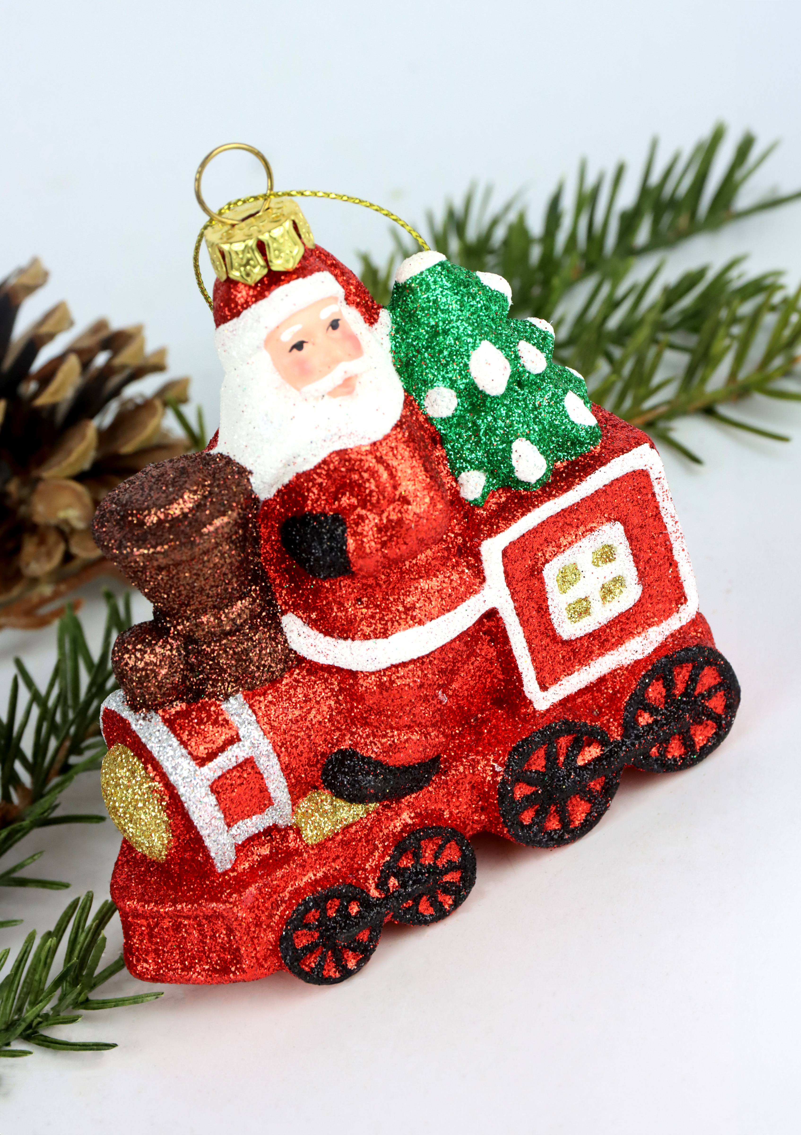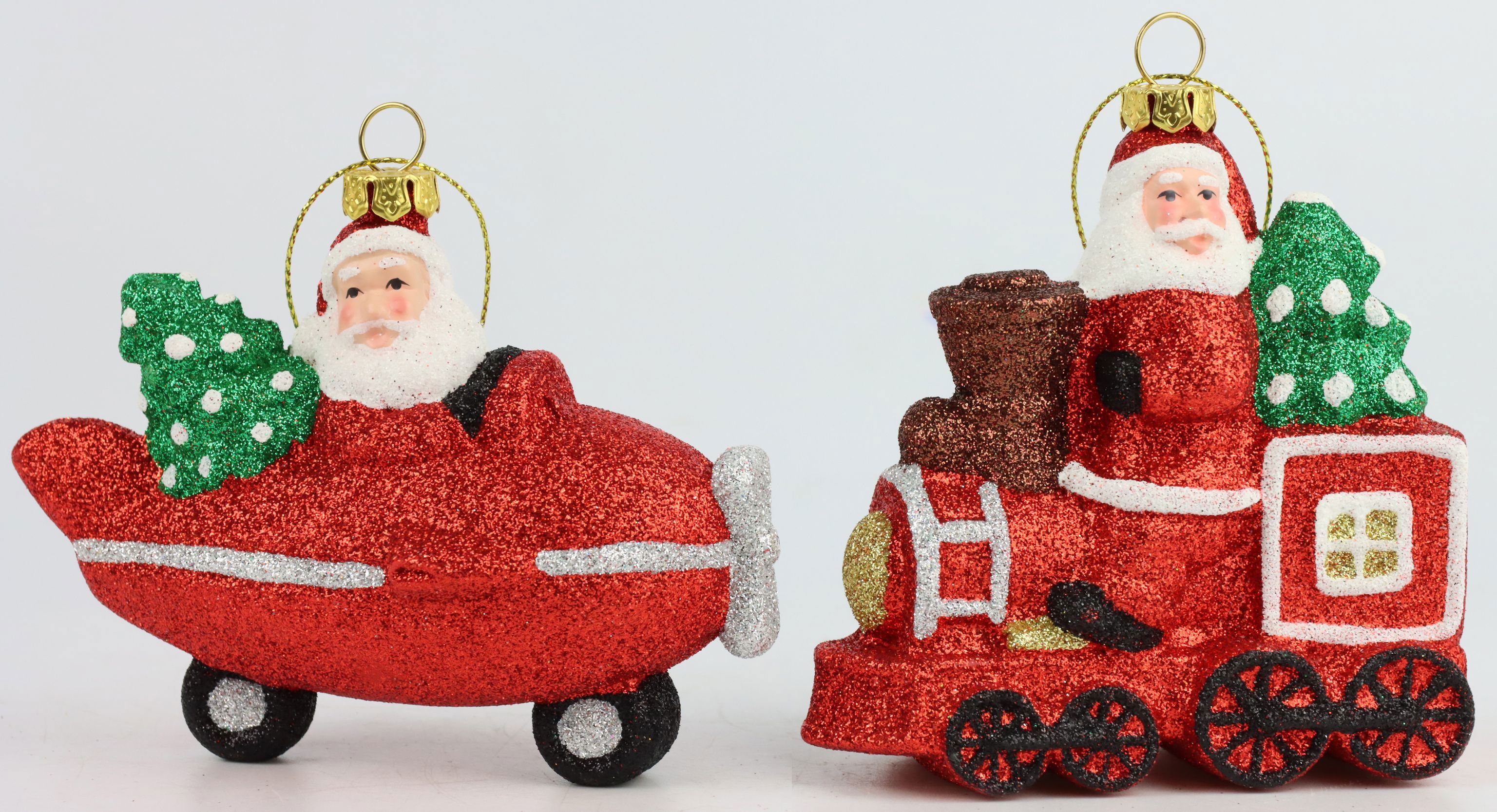 Das 2-teilige Set umfasst einen Weihnachtsmann auf einem Flugzeug und einen auf einer Eisenbahn. Hergestellt aus hochwertigem Kunststoff, überzeugen diese kleinen Kunstwerke mit ihrer prächtigen Ausarbeitung und reichen Details. Etwa 9 cm lang, versehen mit funkelndem Glitter, werden diese Zierhänger zu repräsentativen Highlights Ihrer festlichen Inszenierungen.