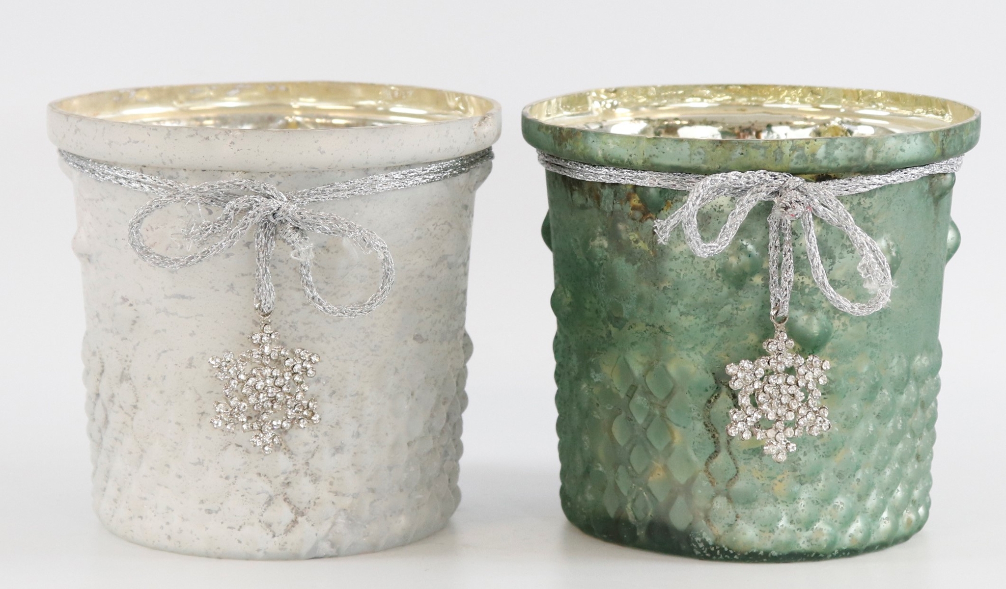 - **Zweiteiliges Set:** Enthält zwei Windlichter aus Metall und Glas in Weiß und Grün.