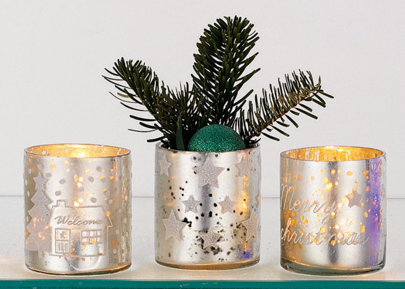 - Weihnachtliche Tischlichter in einem Set aus drei Gläsern mit der Prägung "MERRY CHRISTMAS"