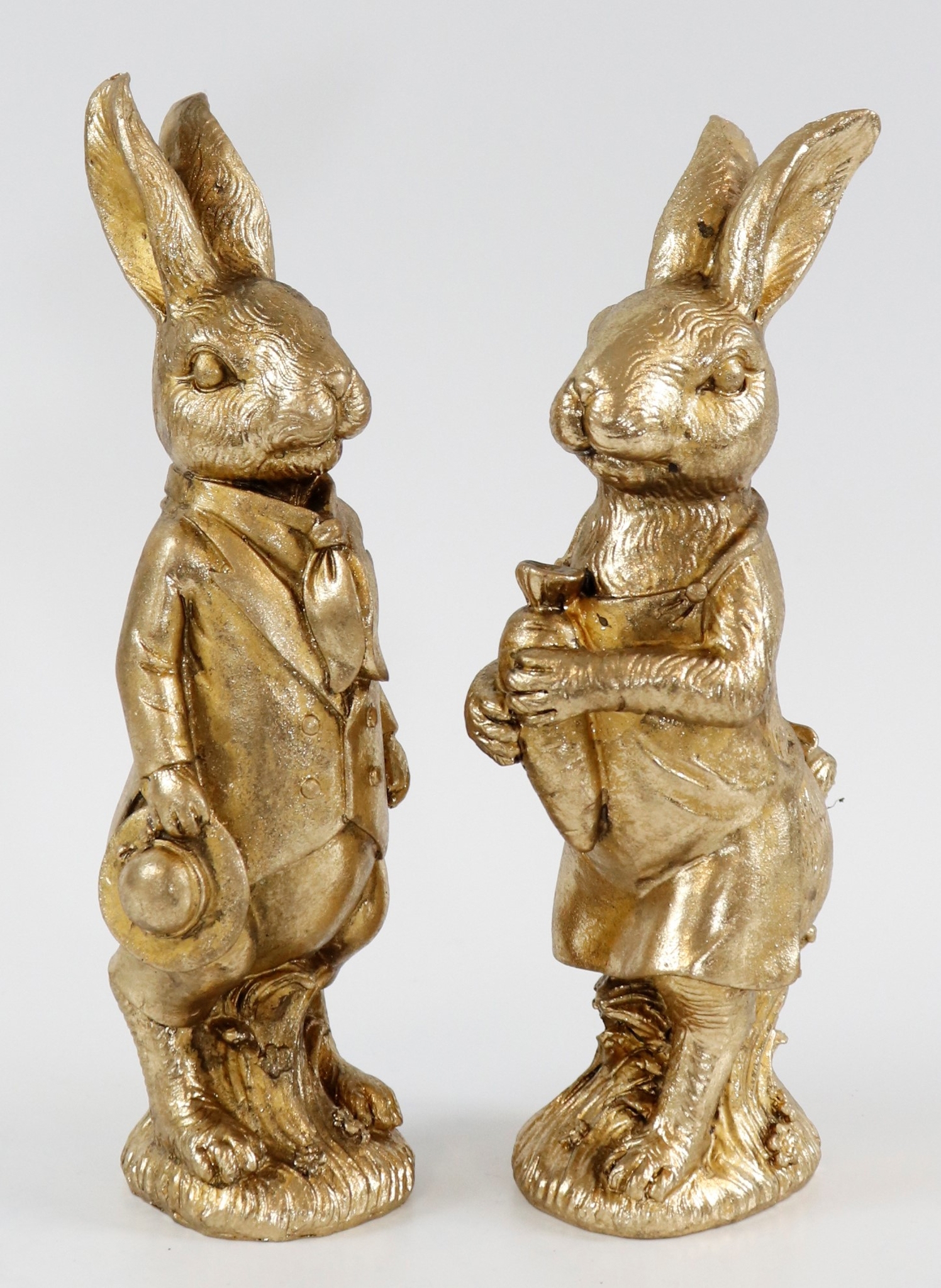 Die sorgfältige Handwerkskunst zeigt sich in jedem Detail dieser Goldhasen, die in traditioneller Pose gestaltet sind. Diese Dekoration regt die Fantasie Ihrer Kunden an und lädt zum Kauf ein. Mit ihrer zeitlosen Optik passen die Hasen sowohl in klassisch als auch modern eingerichtete Räume, wodurch sie besonders vielseitig einsetzbar sind.