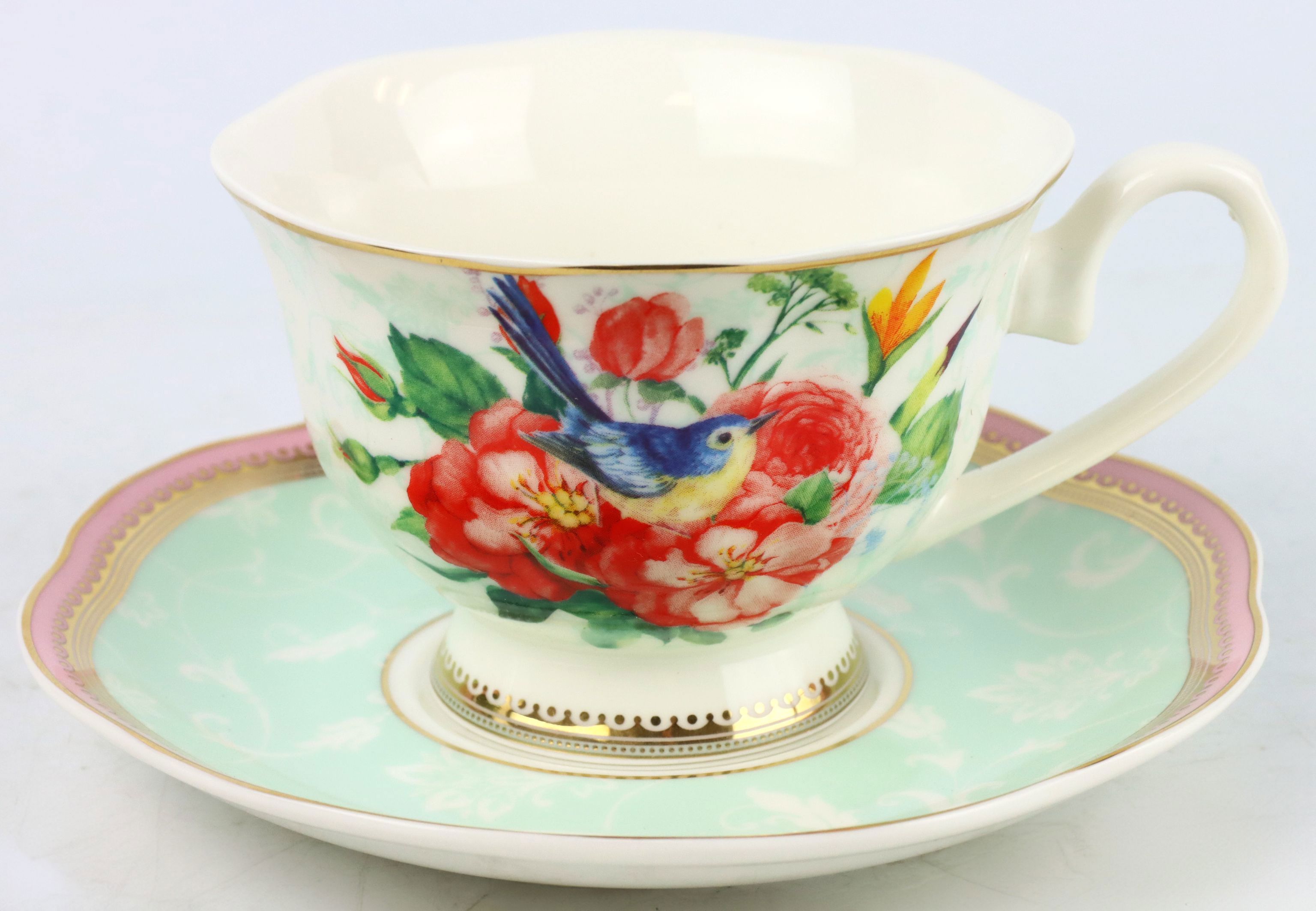 The central element of any sophisticated coffee table is the motif of a charming bird, which is skilfully placed on the fine porcelain (New Bone China). This material is known for its particular durability and elegant appearance, which your customers will undoubtedly appreciate. New Bone China is successful in combining robustness and aesthetic pleasure, making it perfect for the high-end home and lifestyle retail sector.