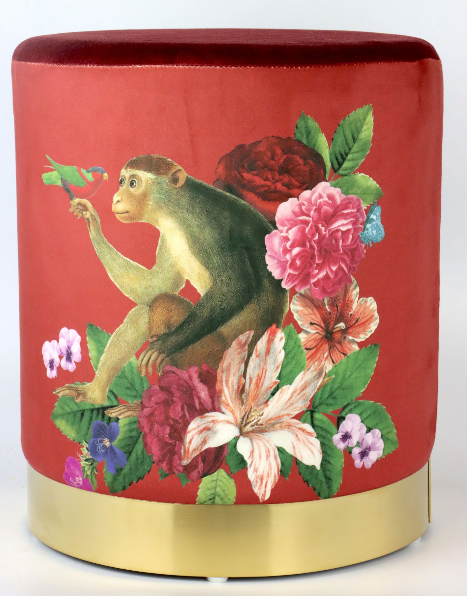 Keywords: pouf, home accessory, B2B product, retail, robust wood, high-quality polyester, durable metal, funky monkey, monkey motif, colourful design, autumn/winter collection.