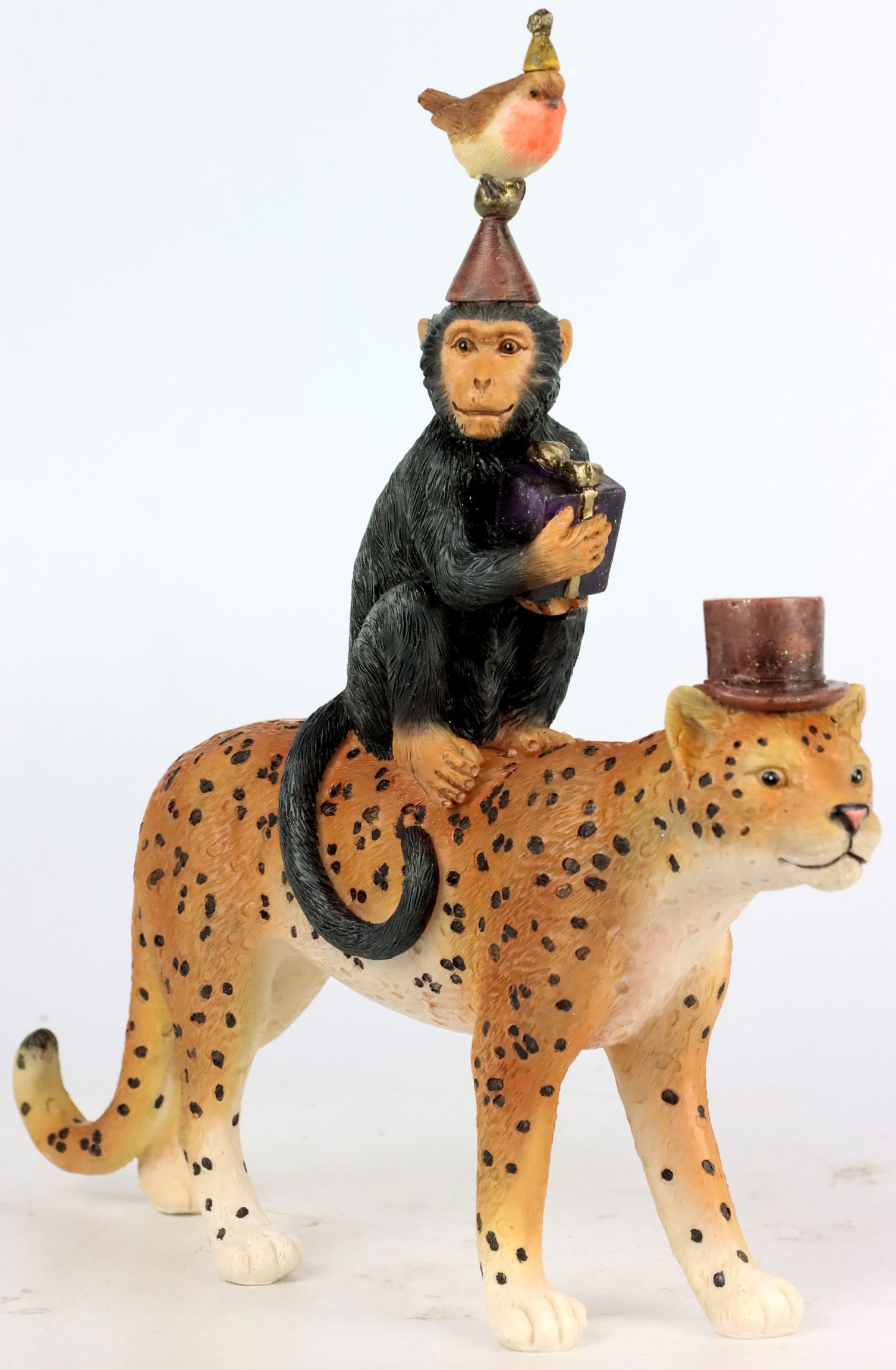 Discover the fascinating "Carnivale" figurine - a truly extraordinary work of art that should not be missing in any stylish living environment. This unique figurine combines the elegance of a majestic jaguar with the playfulness of a monkey wearing a top hat in an inspiring way. It is the perfect expression of exclusivity and creativity and is ideal as an eye-catcher for stationary retail in the home and lifestyle sector.