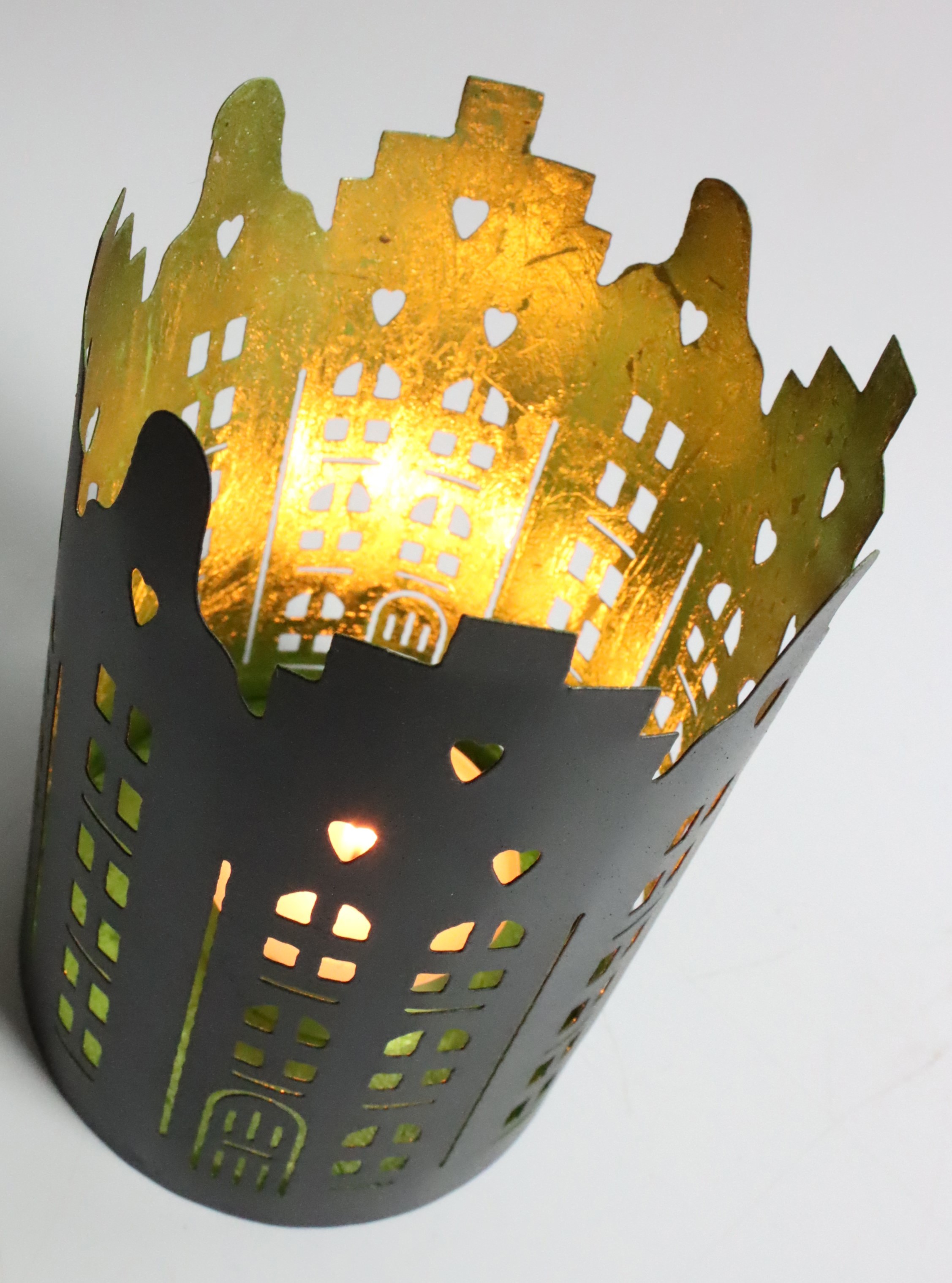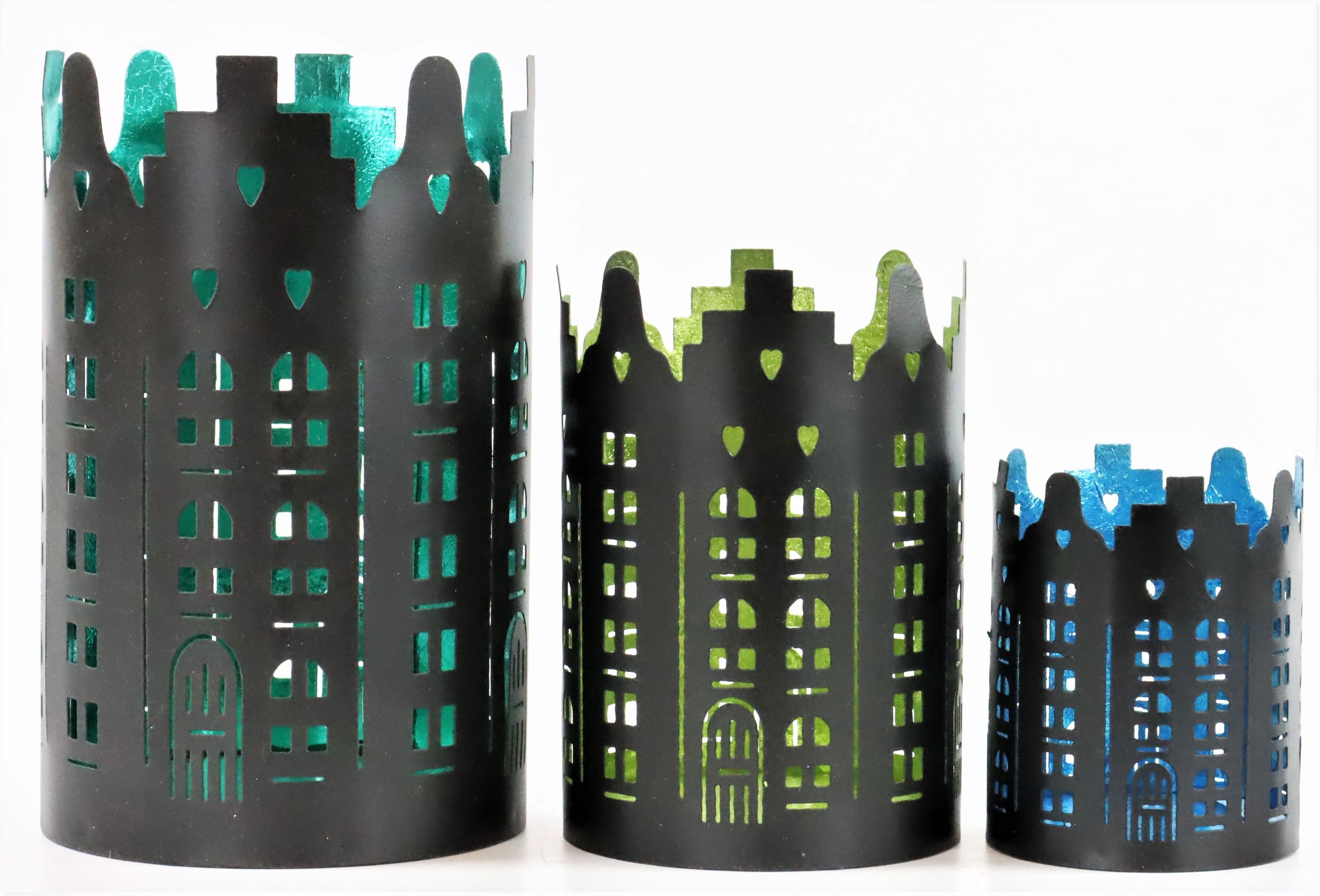 Discover our enchanting 3-piece "City" lantern set, specially designed for the autumn and winter season. The unique lanterns not only bring atmospheric lighting into your home, but also a touch of urban flair. Made from high-quality iron, these lanterns come in stylish colours: turquoise, green and blue. Each lantern is available in a different size, with a diameter of approx. ø13 cm, ø10 cm and ø8 cm - ideal for creating a harmonious yet interesting arrangement.