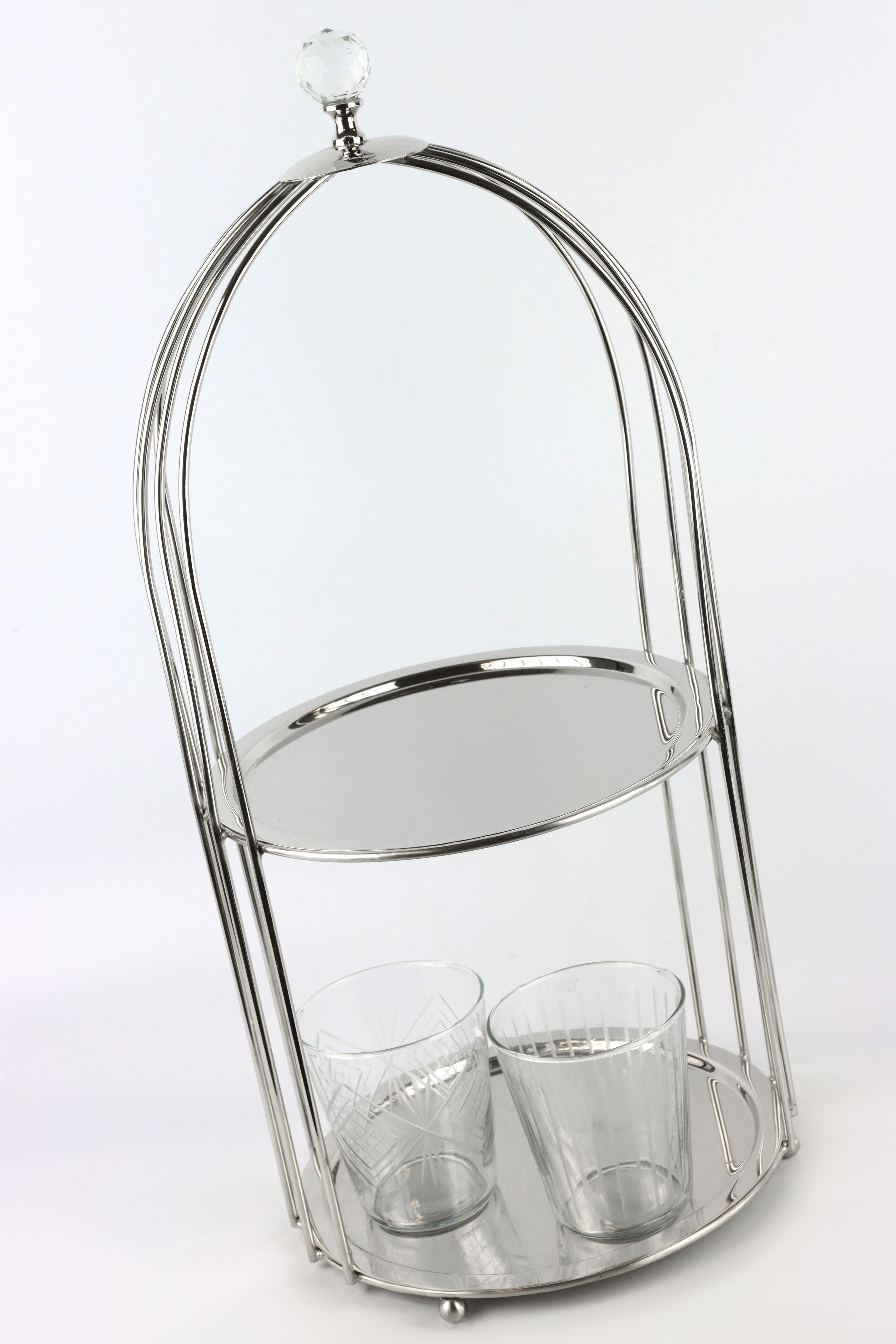 Experience the perfect synthesis of practical use and elegant design with our two-tier ETAGERE "CAGE" in attractive silver. This exquisite piece is ideal for stationary retail in the home and lifestyle sector and will undoubtedly attract the attention of your customers.