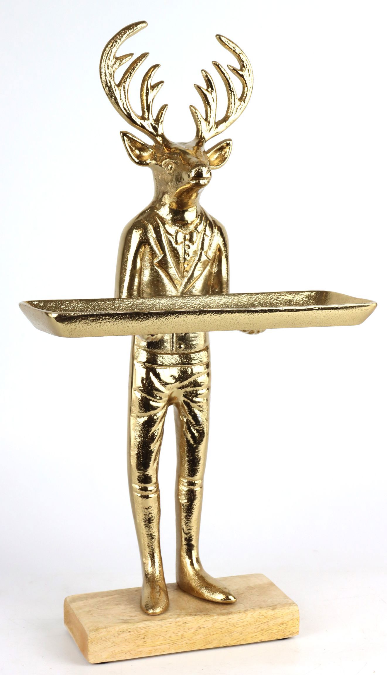 Transform your home into a stylish oasis of well-being with our exclusive stag butler in gold. This exquisite decorative element is more than just a functional helper - it is a real highlight in any living space. The golden deer butler is the perfect accessory that will delight your customers, especially for stationary retail in the home and lifestyle sector.