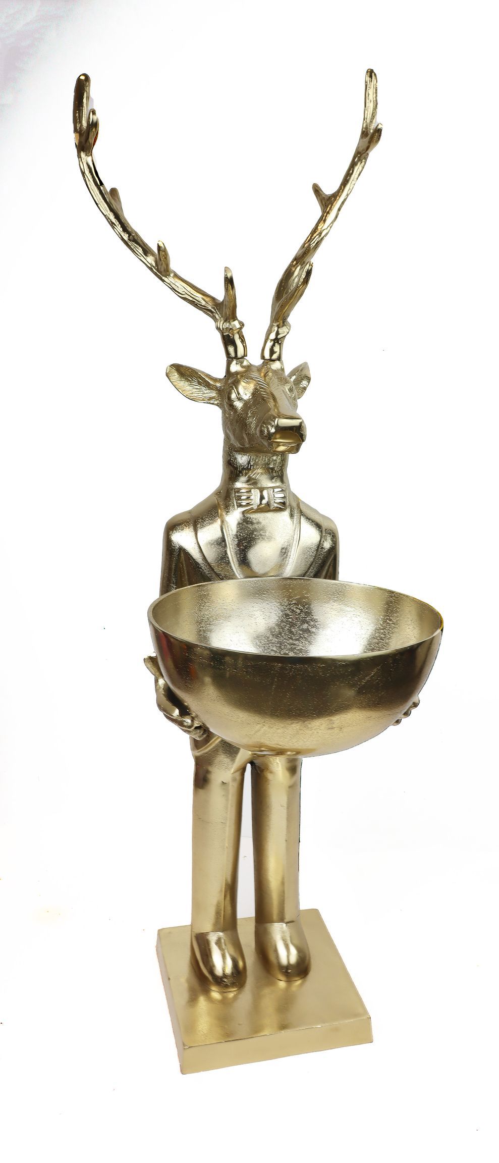 Autumn and winter are the seasons when a particularly warm and inviting ambience is crucial for inspiring customers in stationary retail stores. With the exclusive butler stag with bowl in gold, you not only bring a unique work of art into your shop, but also offer your customers a real eye-catcher for the sophisticated home. Made from high-quality, nickel-plated aluminium and with an impressive height of approx. 116 cm, this decorative item combines functionality and aesthetics in an incomparable way.
