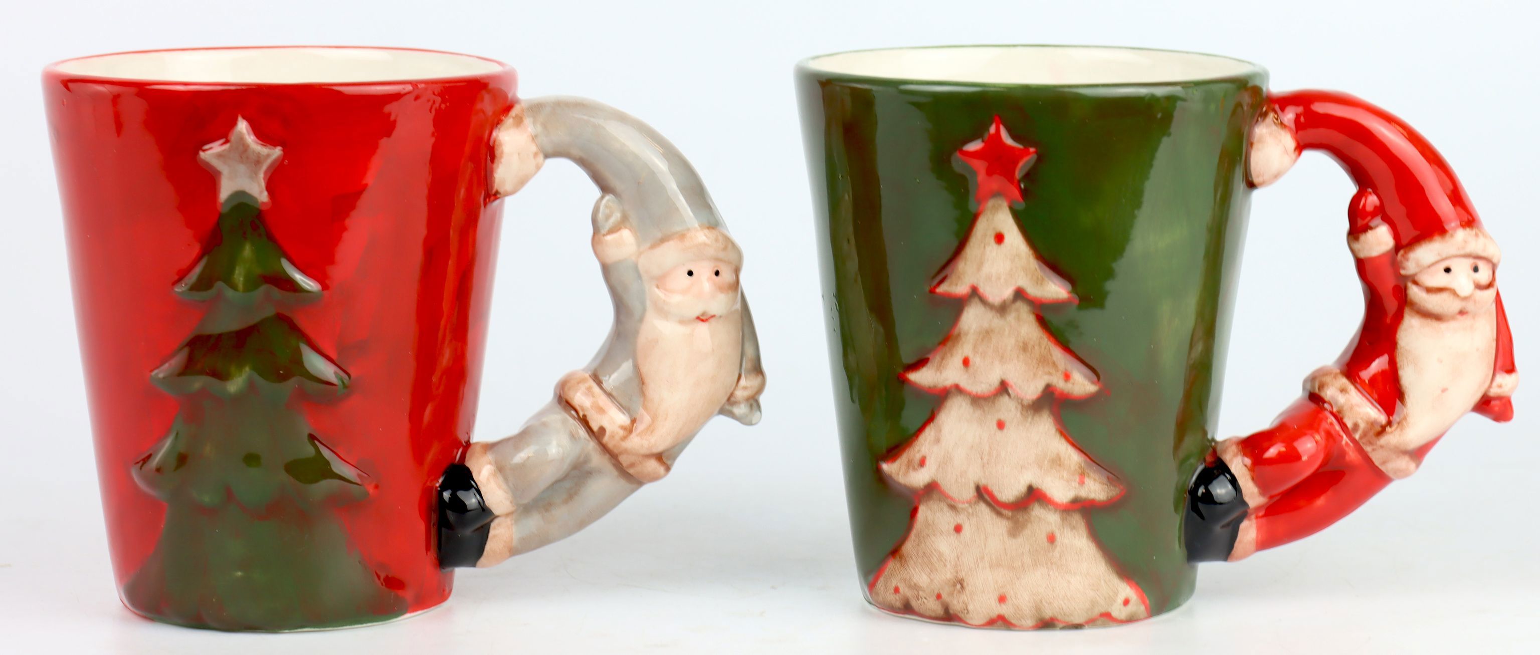 These ceramic mugs are characterised by their lovely details: A pattern of fir trees combined with fascinating Father Christmas handles in the classic Christmas colours of red and green. This makes them an ideal accessory for any Christmas table decoration and is perfect for serving warm drinks such as tea, coffee or hot chocolate.