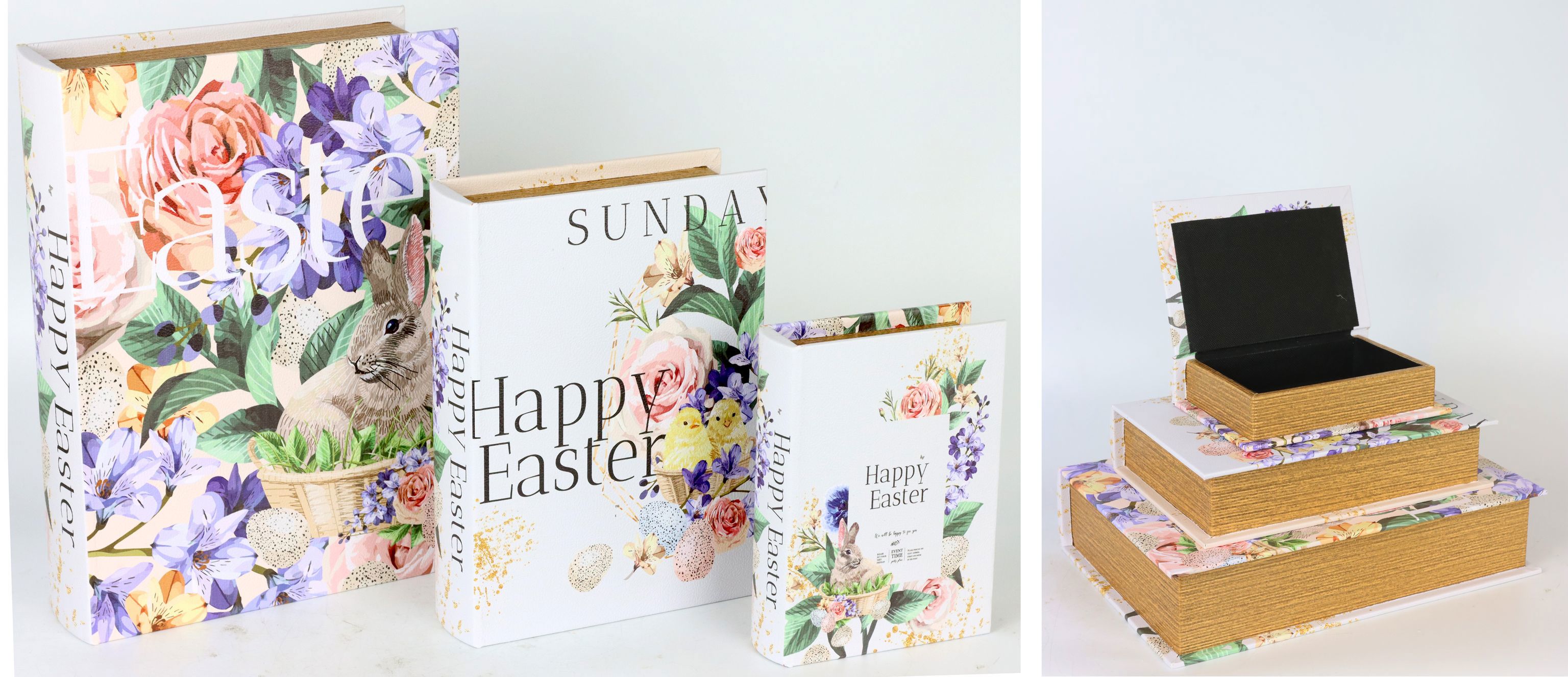 Add to the ambience of your shop at Easter time with the stylish "HAPPY EASTER" folio set. This decorative box set in the shape of books combines elegance with functionality and offers an ideal solution for storage and decoration. Made from high-quality wood and designed in a classic white colour, the set combines practical use with aesthetic charm and appeals to customers who appreciate unusual home and lifestyle items.