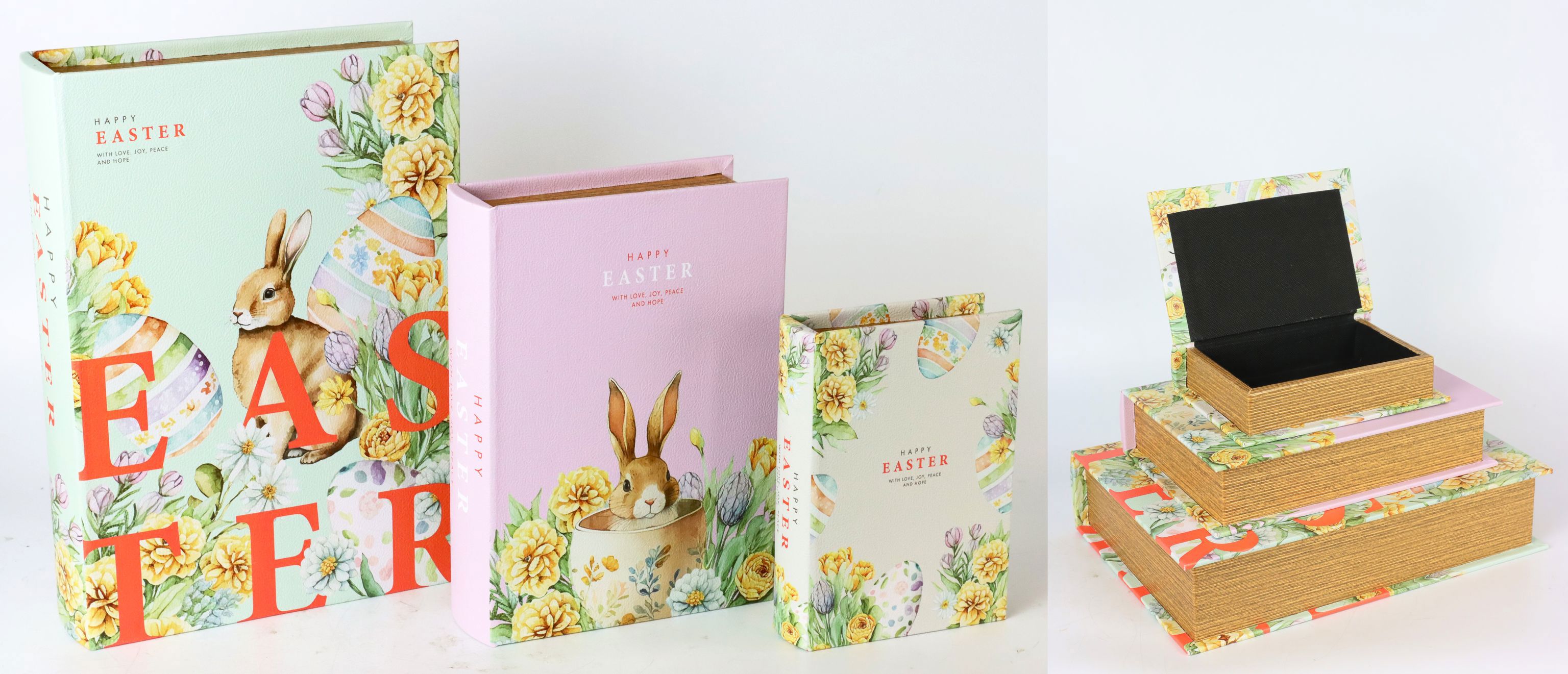 The box set impresses with its charming design in pastel-coloured tones, ideal for the Easter theme. The boxes are designed in the shape of books, which gives a nostalgic yet elegant impression. Made from high-quality wood, the set promises durability and stability so that you can offer your customers a product of the highest quality.