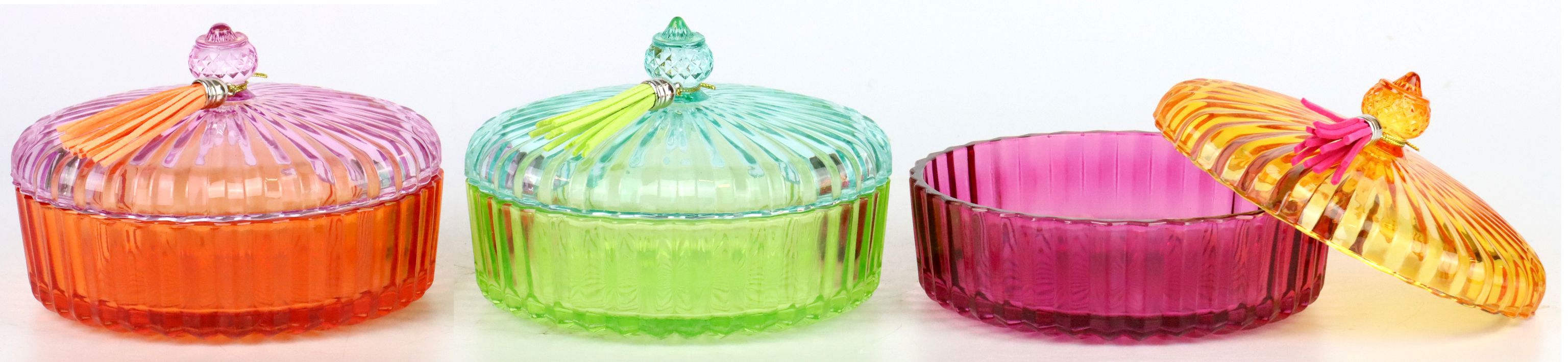 - **Juego de tres piezas:** Tres tarros de cristal de colores que miden aprox. 14x8 cm para un uso versátil.