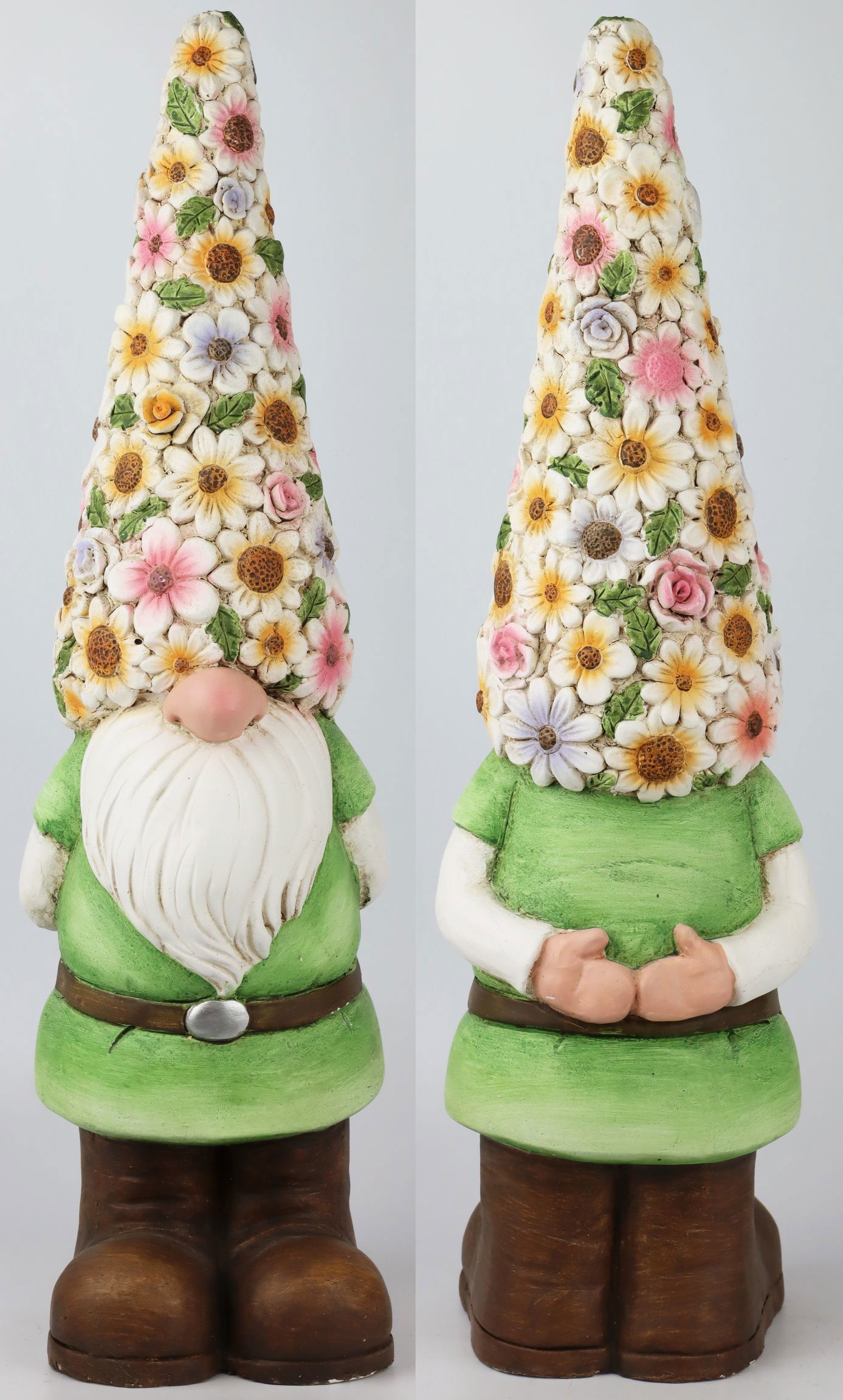 **Descripción del producto: Figurita "Gnomo flor" de fibra de arcilla (aprox. 61 cm) - Colección primavera/verano**