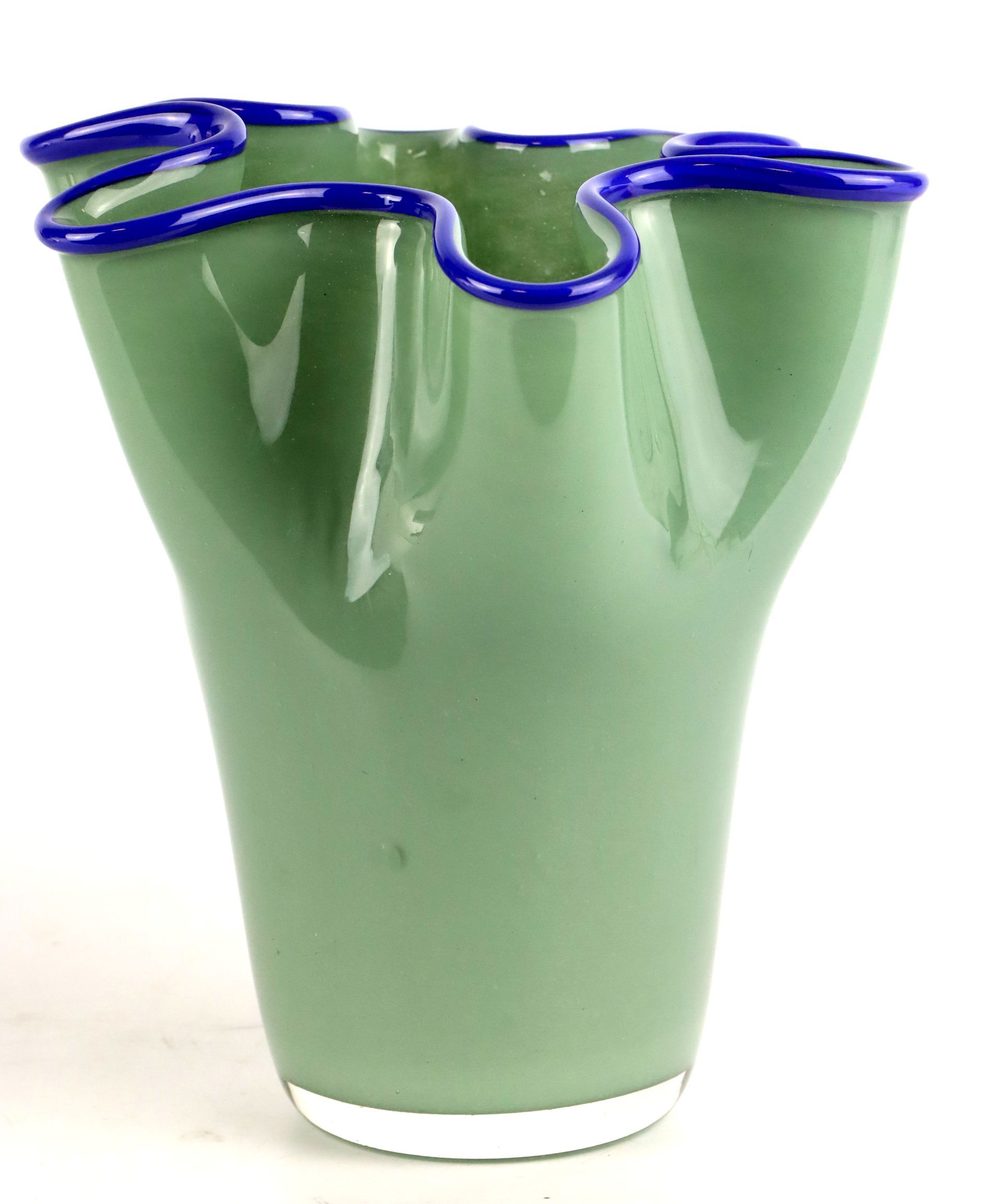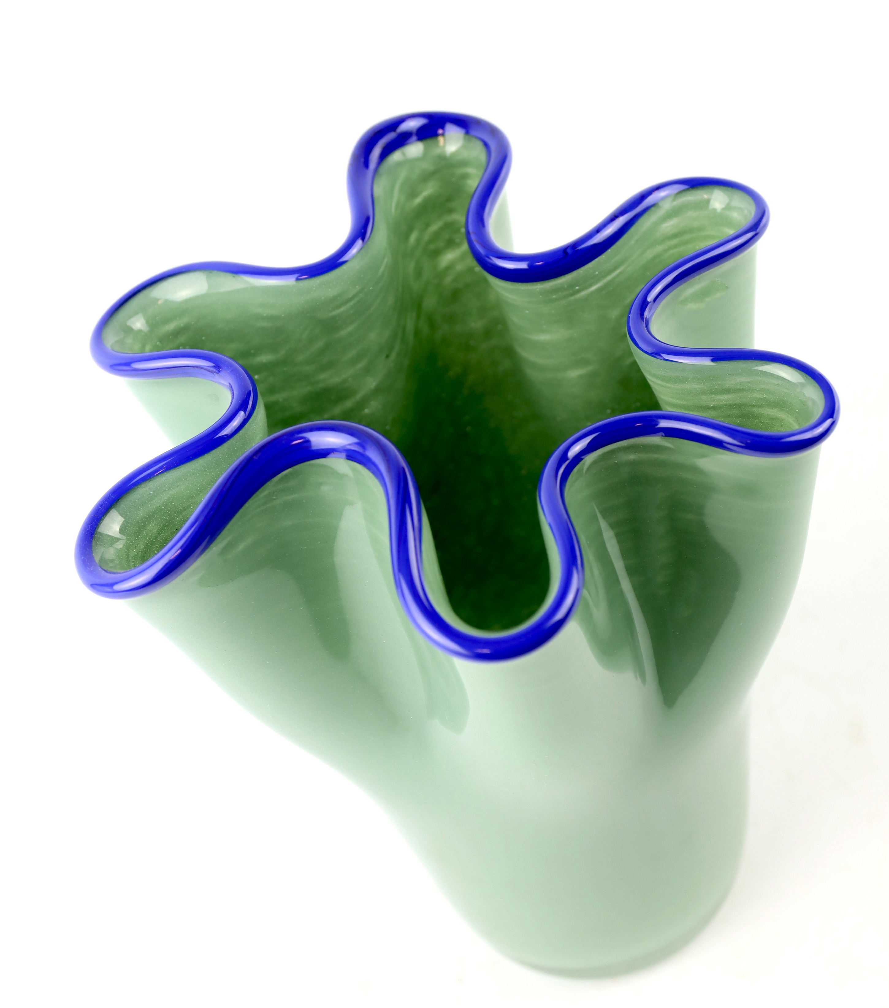 **Descripción del producto: Jarrón "Art Nouveau" de estilo Art Nouveau, verde con borde azul**.