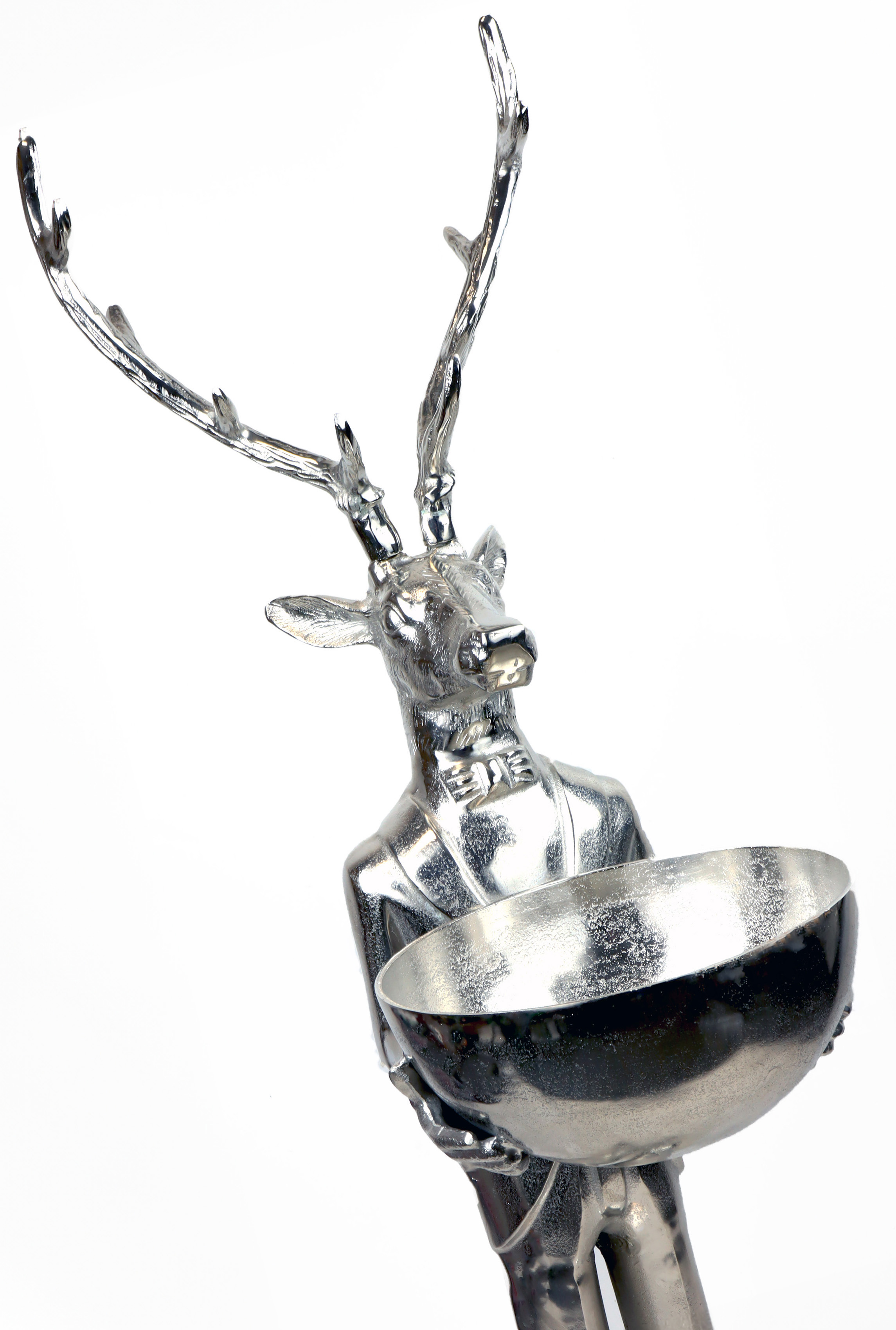 Con unas medidas aproximadas de 116 cm, este ciervo mayordomo atrae todas las miradas y es ideal para la temporada otoño/invierno. La superficie plateada sutilmente brillante confiere al ciervo mayordomo un aspecto sofisticado que puede integrarse perfectamente tanto en estilos de interior modernos como clásicos. Este objeto decorativo de otoño/invierno es más que una simple pieza decorativa: su cuenco plateado ofrece espacio para todo tipo de objetos pequeños, desde llaves y joyas hasta pequeños aperitivos o adornos florales de temporada.