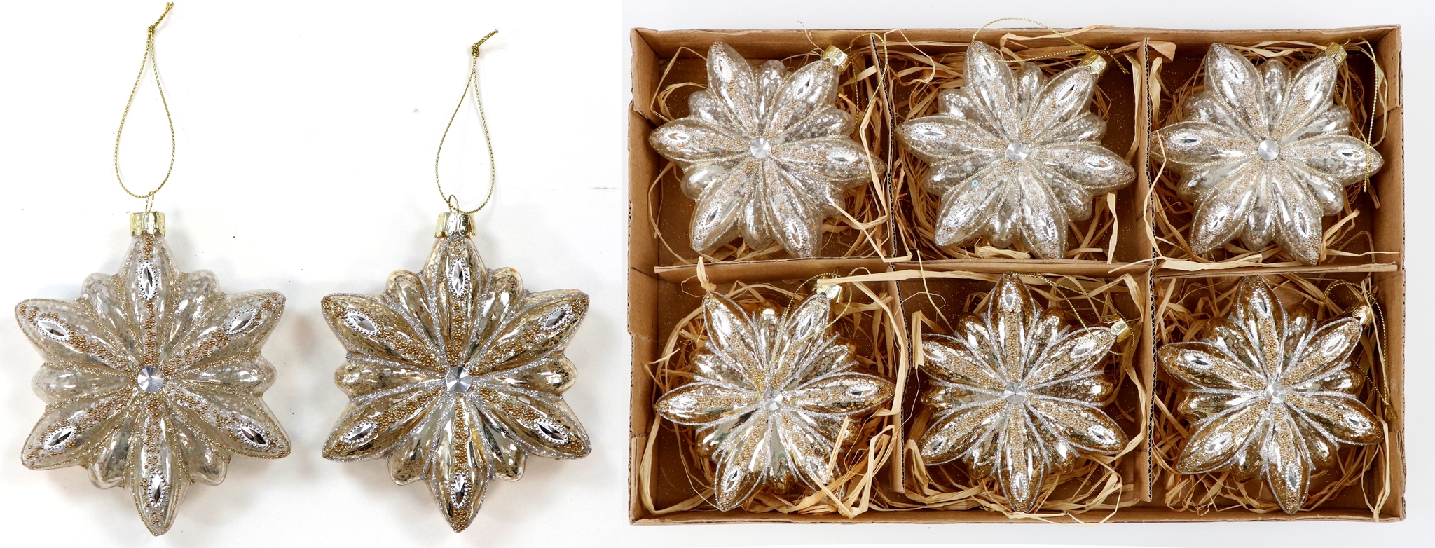 ESCon el número de artículo 3098, presentamos nuestro exclusivo juego de BOLAS DE VIDRIO "ESTRELLAS" S/6. Este juego consta de seis bolas de vidrio hábilmente elaboradas que realzan a la perfección su ambiente navideño con sus detalladas y afiligranadas decoraciones en forma de estrella. Con un diámetro de unos 12 cm, las bolas de cristal son un verdadero elemento decorativo para cualquier hogar decorado con motivos navideños.