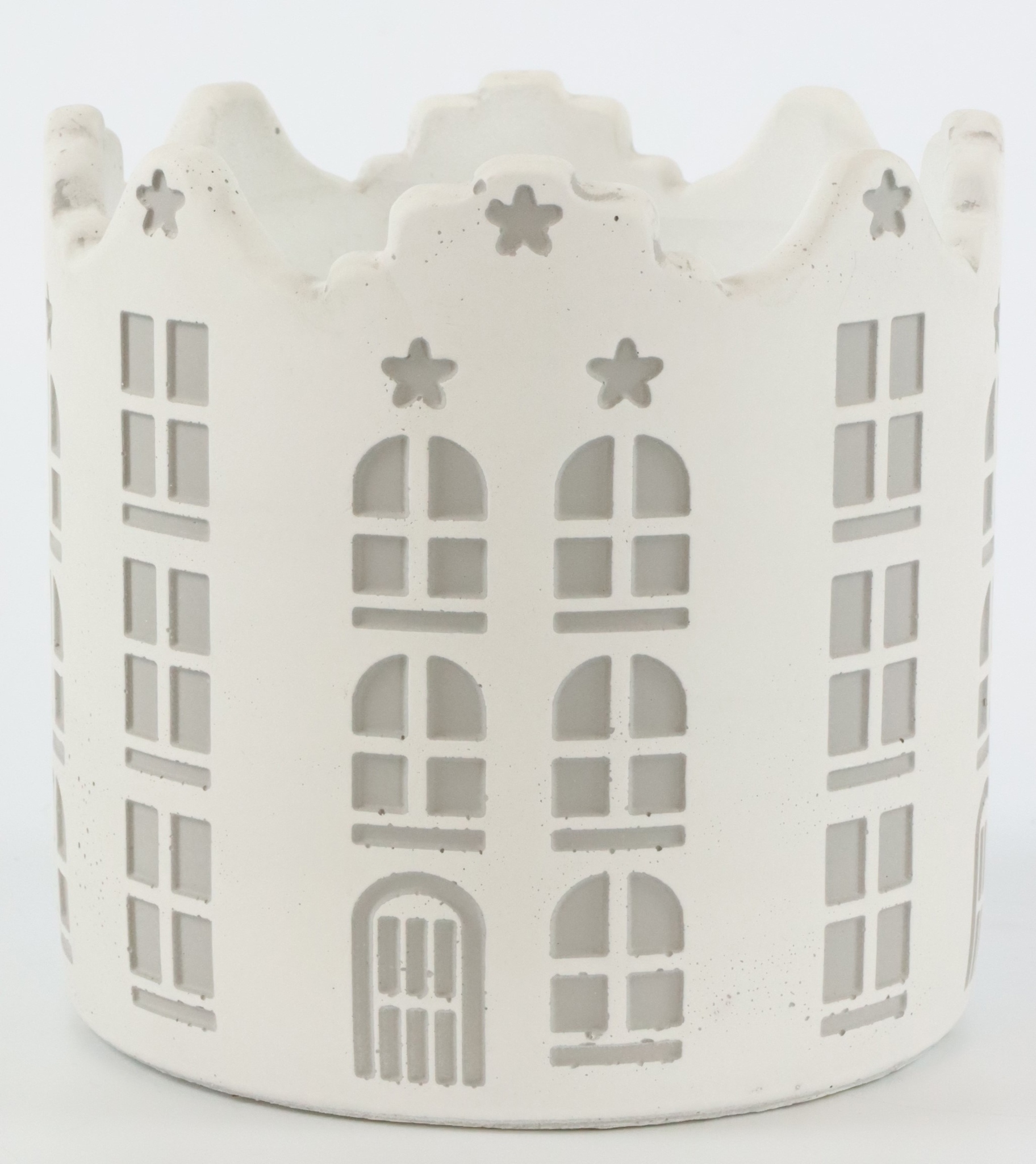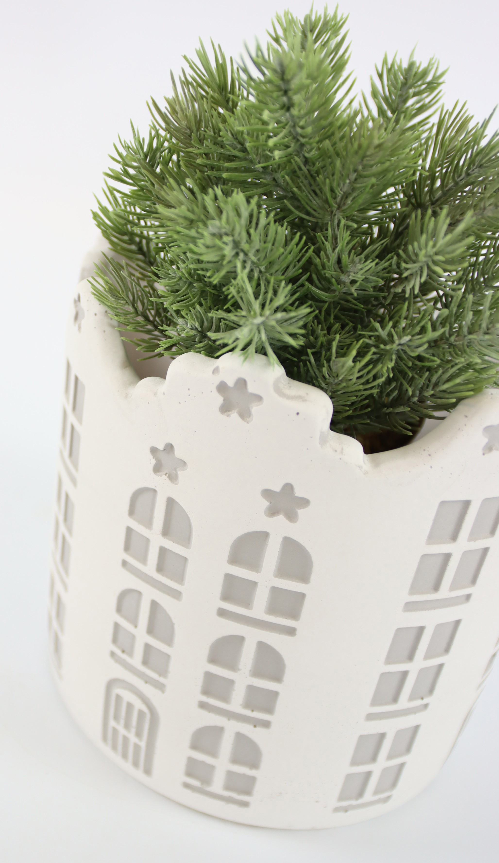 La cacerola "TOWNSHIP" impresiona con un inspirador motivo urbano que representa un festivo país de las maravillas invernal. Con un diámetro de unos 18 cm, es ideal para exponer con estilo sus plantas navideñas favoritas. Su color neutro armoniza maravillosamente con una gran variedad de plantas y decoraciones, lo que la convierte en un elemento versátil en las decoraciones navideñas.