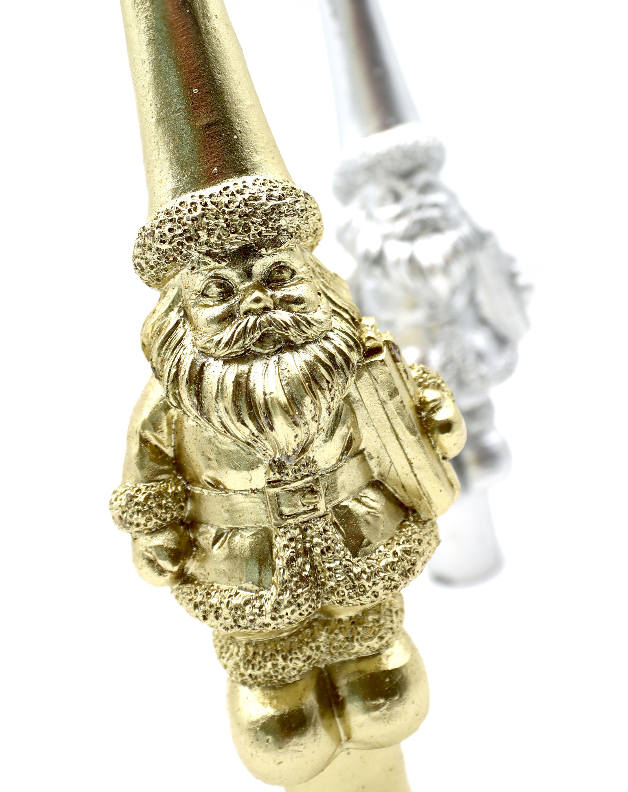 Este set de 2 piezas consta de velas de palo finamente elaboradas en los clásicos colores navideños dorado y plateado. Cada vela mide unos 20 cm de alto y está fabricada con cera de alta calidad, lo que la convierte en un elemento duradero y decorativo para el salón moderno. El detallado diseño en forma de Papá Noel no sólo hace que a los niños se les iluminen los ojos, sino que también añade un toque festivo a cualquier habitación.