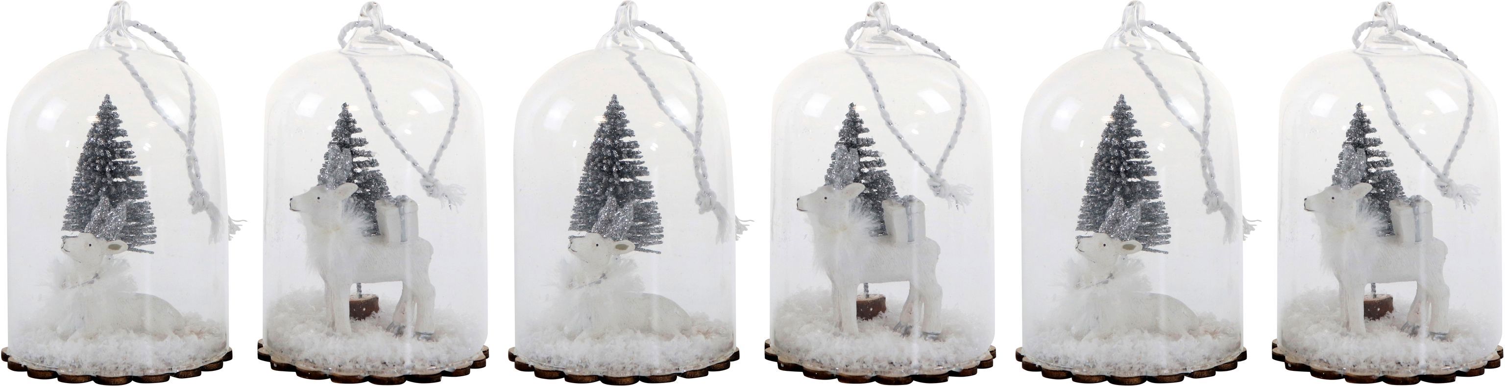 ESEste precioso juego de seis campanillas de cristal con motivo de reno (n.º de artículo: 9258) es el complemento perfecto para cualquier decoración navideña en salones y espacios de ocio. Con su detallado acabado en blanco hecho de poliresina resistente y cristal robusto, estas campanas de cristal crean una sensación de país de las maravillas invernal y evocan un ambiente navideño en cualquier habitación.