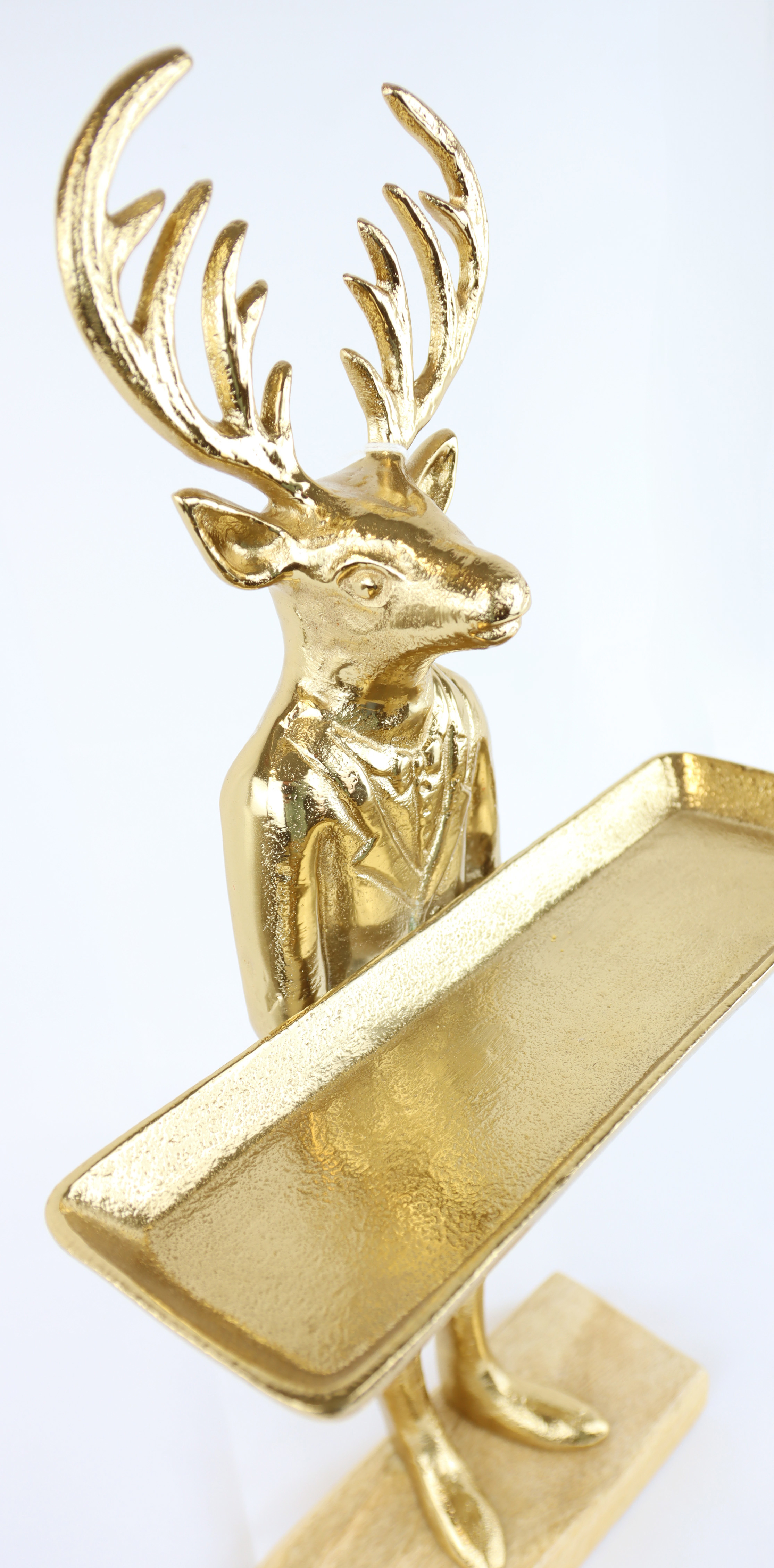 Avec sa surface dorée, il attire l'attention de vos clients et confère à chaque ambiance une note chaleureuse et élégante. C'est surtout pendant la saison automne/hiver, lorsque les jours raccourcissent et que les nuits deviennent plus froides, que le Hirschbutler procure un sentiment de confort et de luxe à la fois. La noble couleur dorée s'harmonise parfaitement avec les couleurs typiques de la saison et se combine à merveille avec d'autres éléments décoratifs pour créer un ensemble cohérent en soi.
