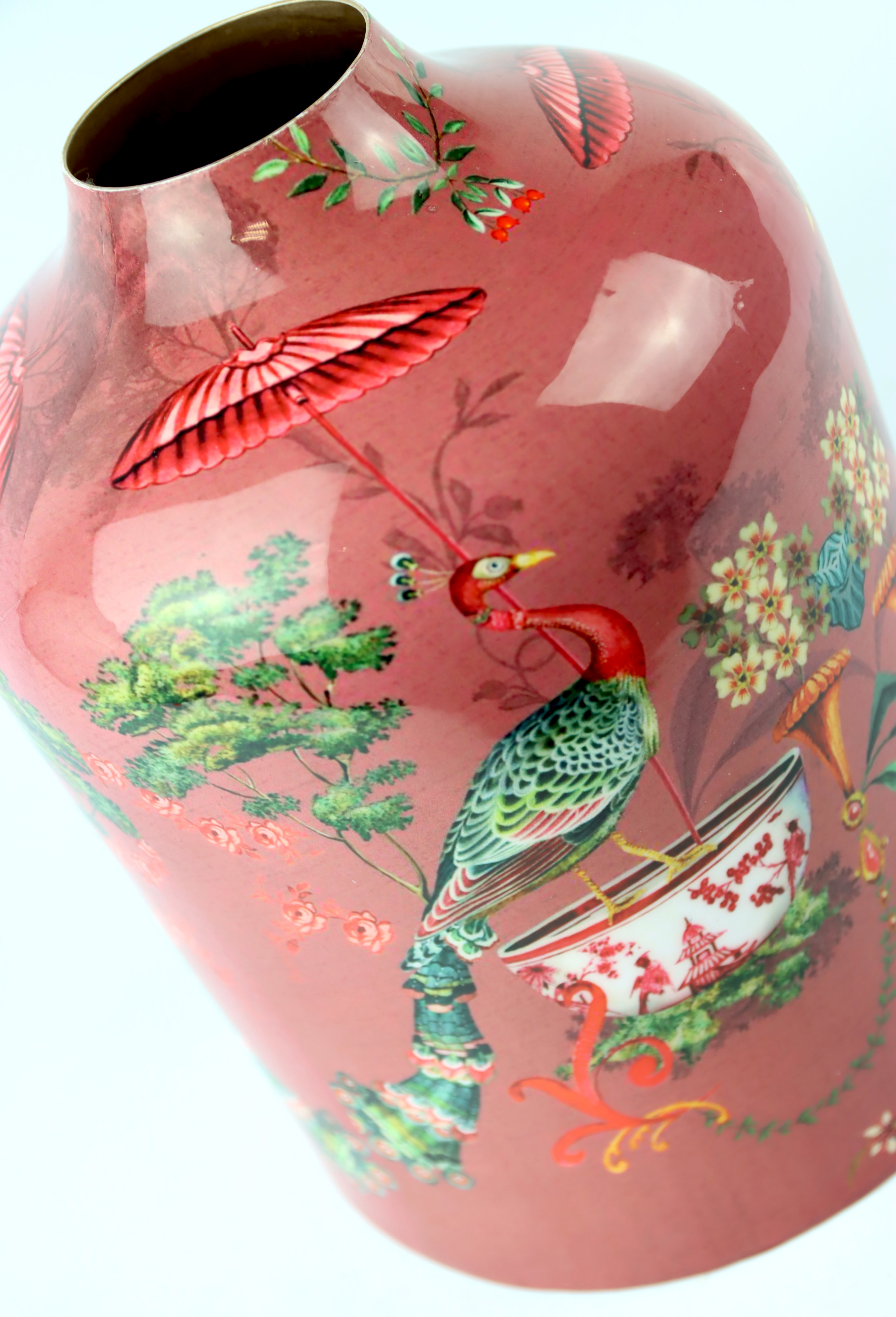 Il vaso "Asian Fauna" colpisce per il suo design artistico e l'armoniosa combinazione di colori in una ricca tonalità di rosso. Un imponente pavone, simbolo di bellezza e grazia nella cultura asiatica, adorna la superficie del vaso e attira immediatamente l'attenzione di tutti. Con un diametro generoso di 18 cm e un'altezza di 23 cm, il vaso è ideale per composizioni floreali di grande effetto o può essere utilizzato come elemento decorativo indipendente per aggiungere un tocco esotico al vostro spazio vitale.