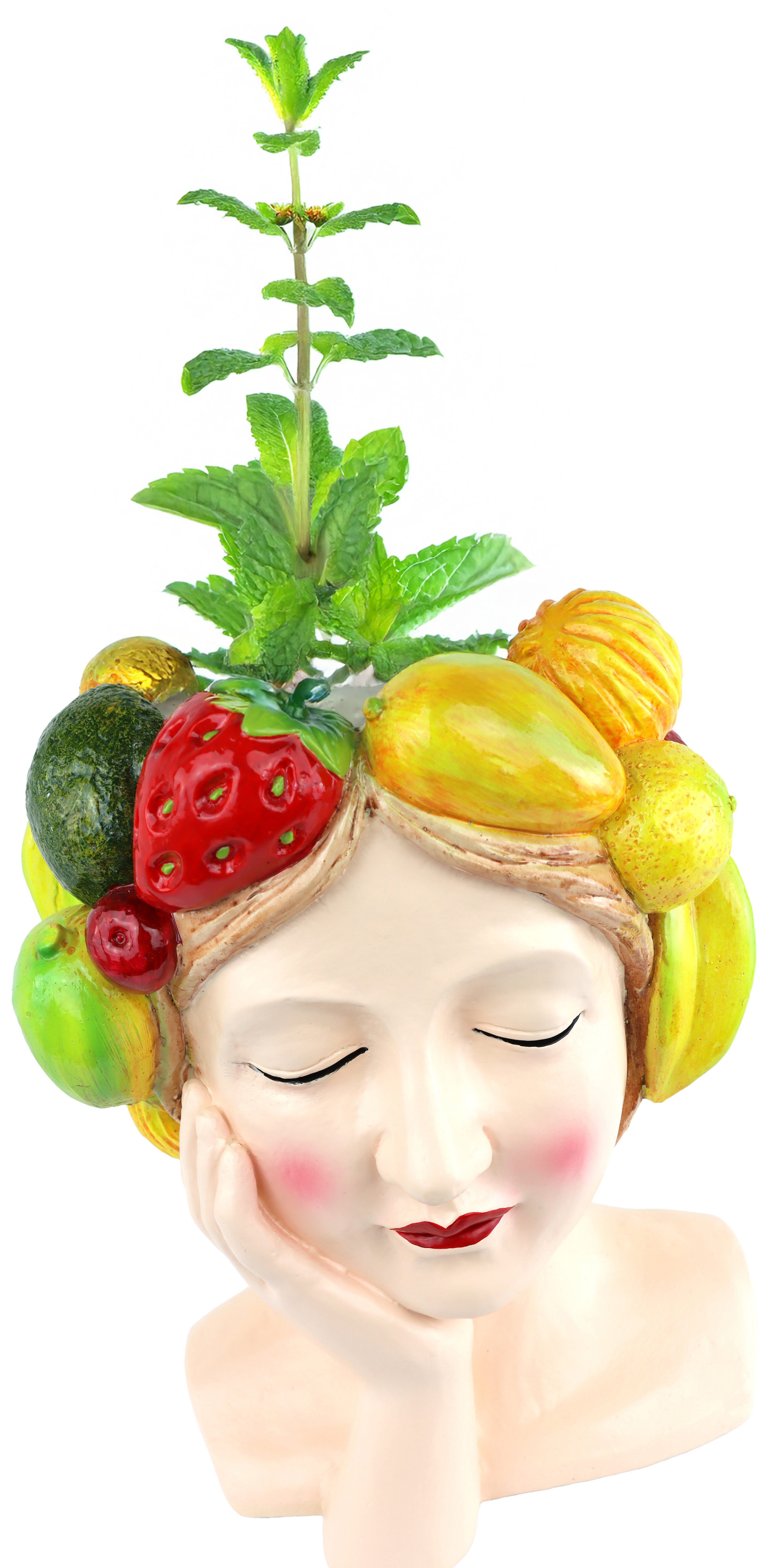 1 **Varietà di utilizzi:** La testa di donna con frutta è un oggetto decorativo versatile, adatto alla decorazione di vetrine, al design di negozi o come centrotavola d'effetto in qualsiasi stanza.