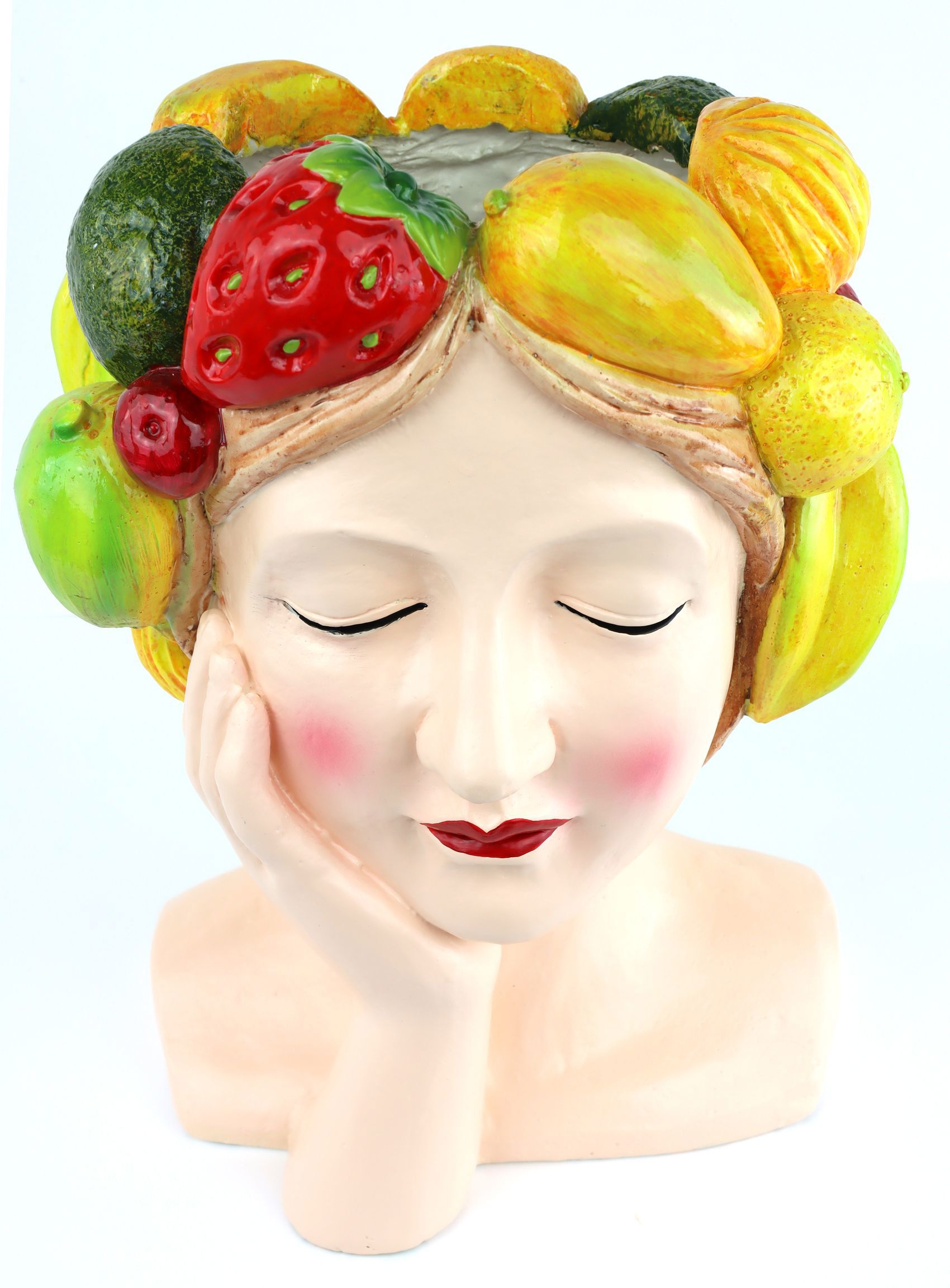 L'oggetto vegetale a forma di testa di donna, abilmente decorato con una ricca selezione di frutti artistici, è realizzato in plastica di alta qualità e misura ben 35 cm. Unisce elegantemente arte e natura e crea un legame armonioso tra elementi floreali e design artistico. Questa scultura non è solo un oggetto decorativo, ma un elemento di conversazione che aggiunge un pizzico di creatività a qualsiasi ambiente.