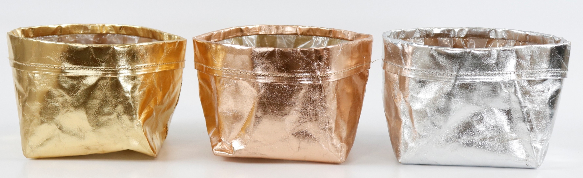 Il nostro set è composto da tre cestini negli affascinanti colori oro, bronzo e argento. Con il loro moderno look metallico, aggiungono un tocco di lusso a qualsiasi interno di negozio. L'uso di materiali di alta qualità, come carta e plastica, fa sì che i cestini non siano solo esteticamente attraenti, ma anche resistenti e robusti. Ogni cestino misura circa 13 cm; ideale per essere esposto su banchi, scaffali o vetrine.