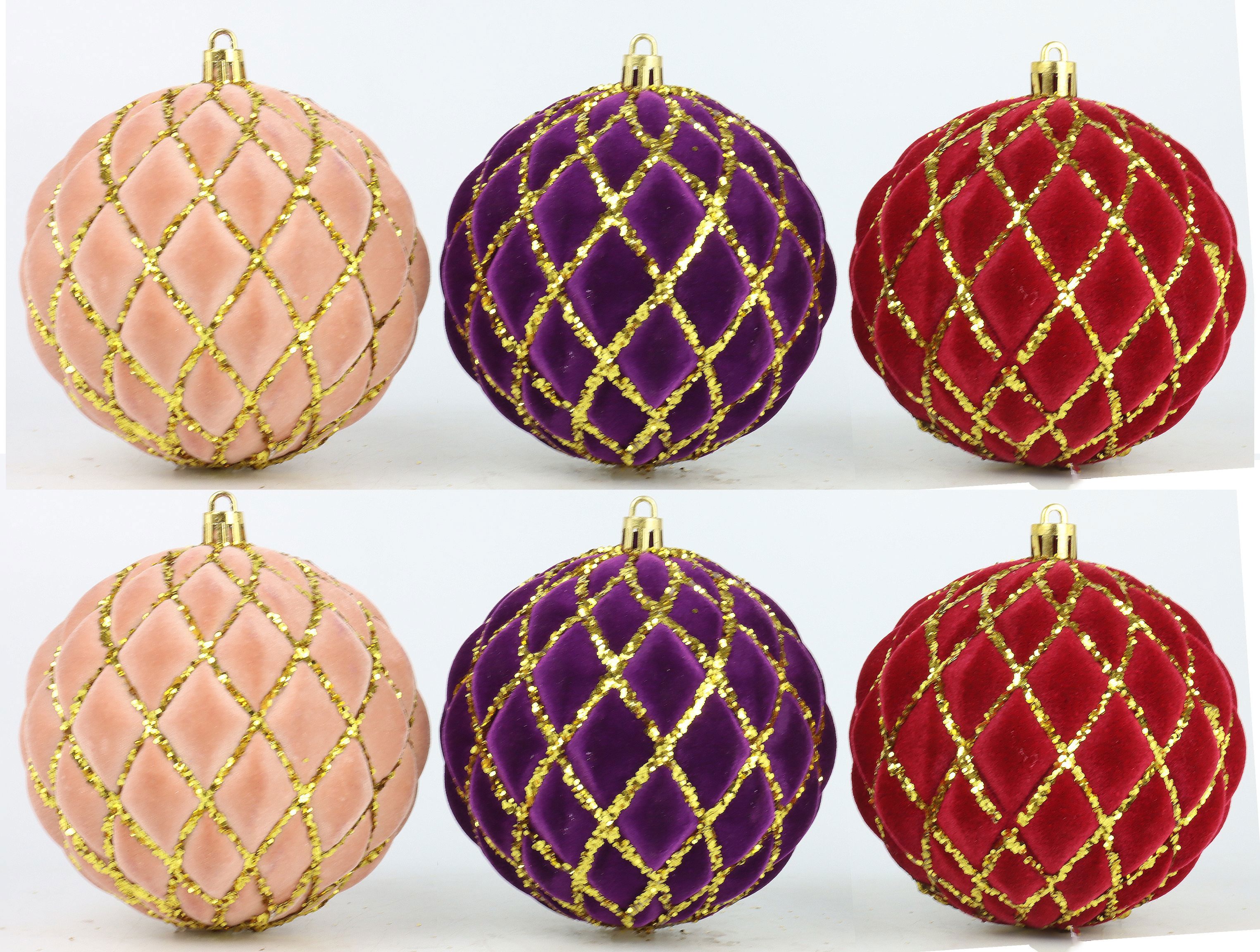 Il rivestimento in velluto conferisce ai baubles una consistenza distintiva e morbida e un'estetica sofisticata, che viene ulteriormente esaltata dalle intense tonalità di colore. La combinazione di rosa, viola e rosso crea un look armonioso e festoso che si integra perfettamente in qualsiasi stile di decorazione natalizia, sia esso tradizionale, moderno o all'avanguardia.