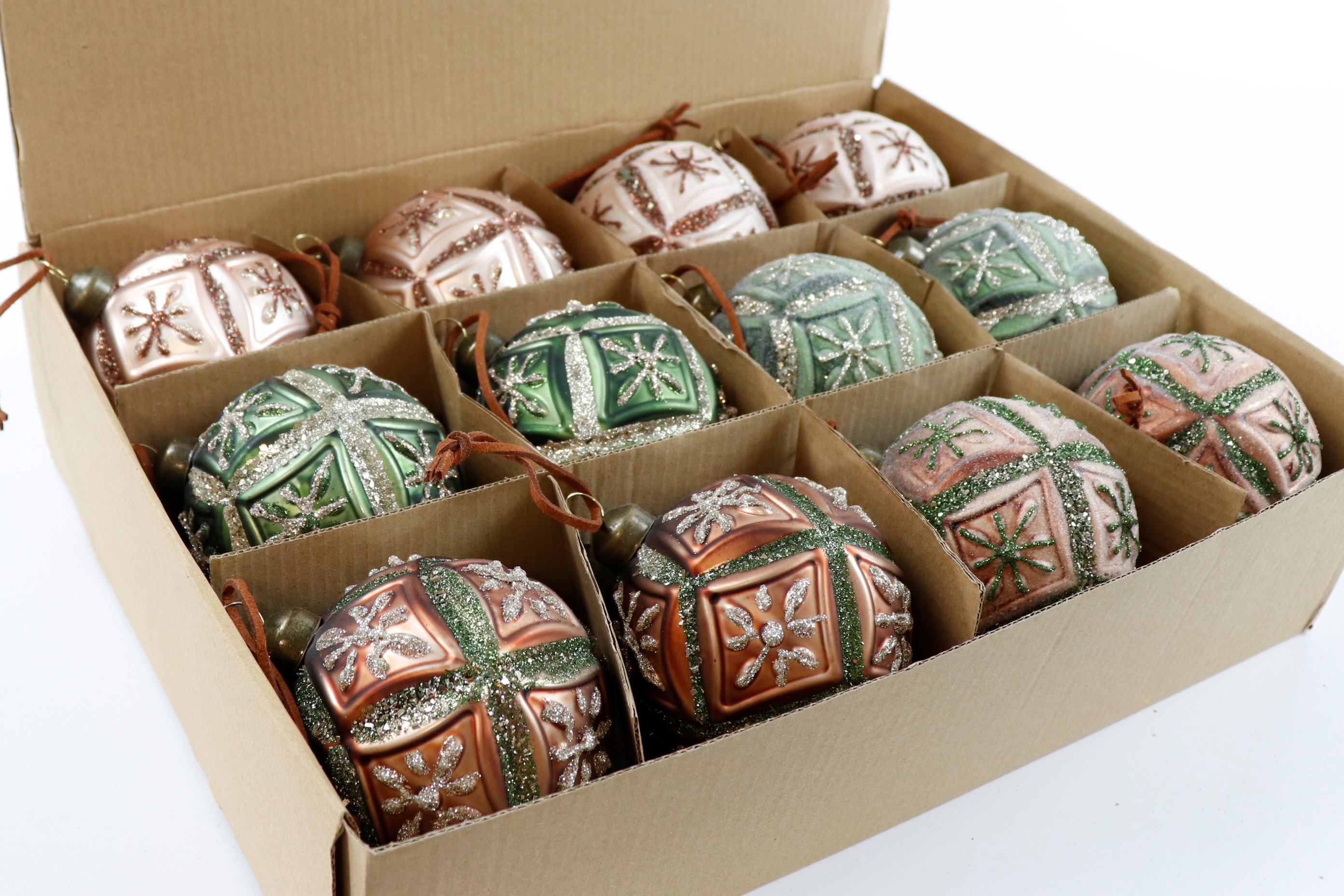 - Un set di 12 pezzi di palline di vetro dal design accattivante, confezionate in un'elegante scatola.