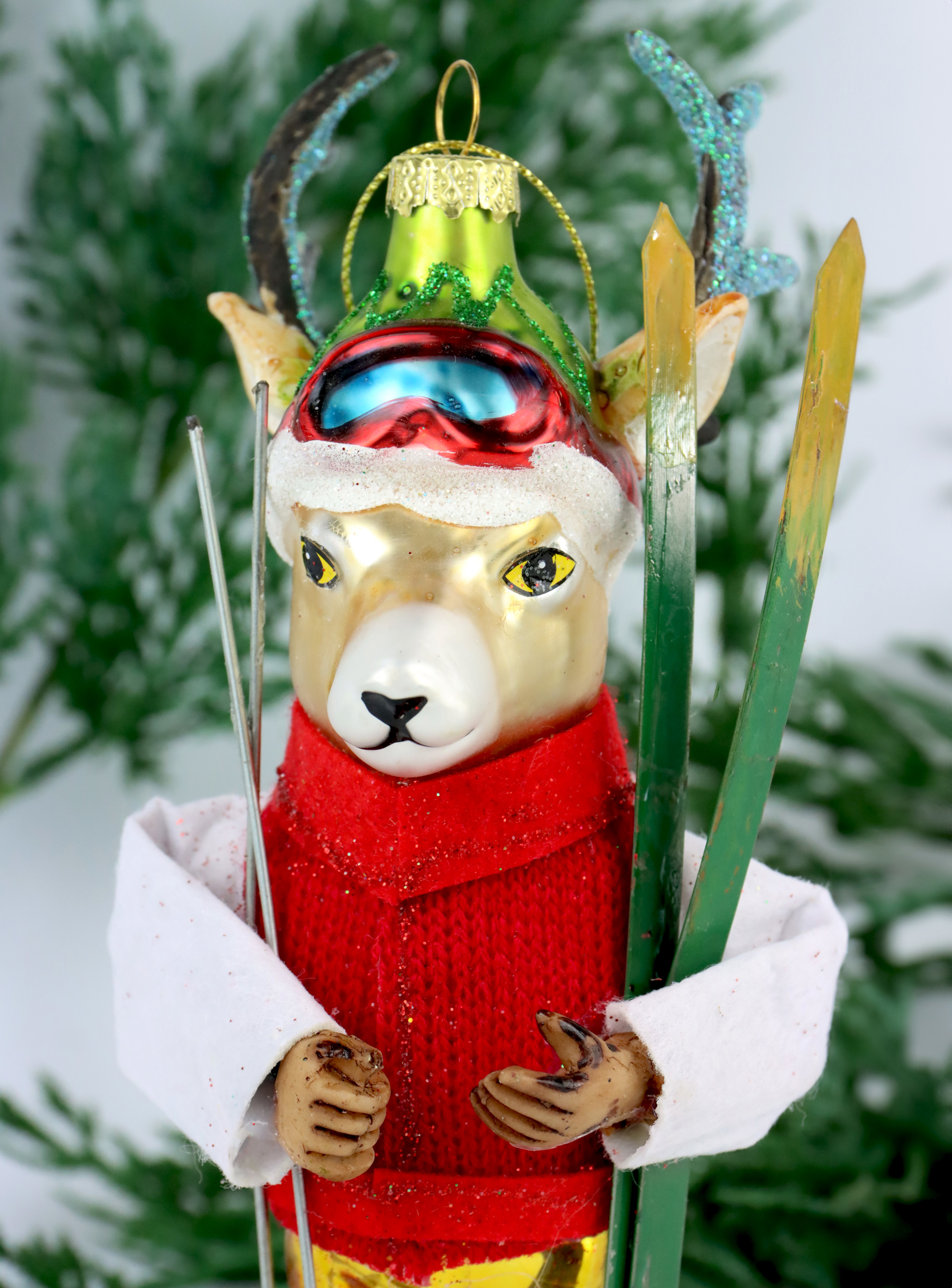 1. ornamento espressivo in vetro "Alce da sci" per il periodo natalizio