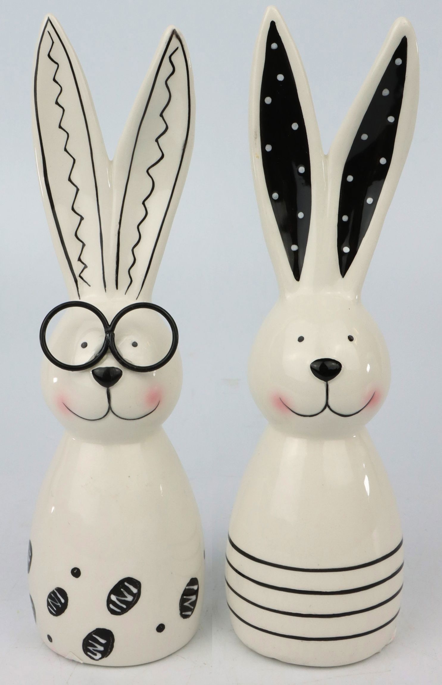 I coniglietti sono realizzati in ceramica di alta qualità e convincono per la loro superficie morbida e liscia e per la raffinata combinazione di colori bianco e nero. Il design minimalista si sposa bene sia con le tradizionali decorazioni pasquali che con i moderni accessori per la casa. In questo modo, non offrirete ai vostri clienti solo un prodotto, ma un'opzione attraente per celebrare la Pasqua con stile.