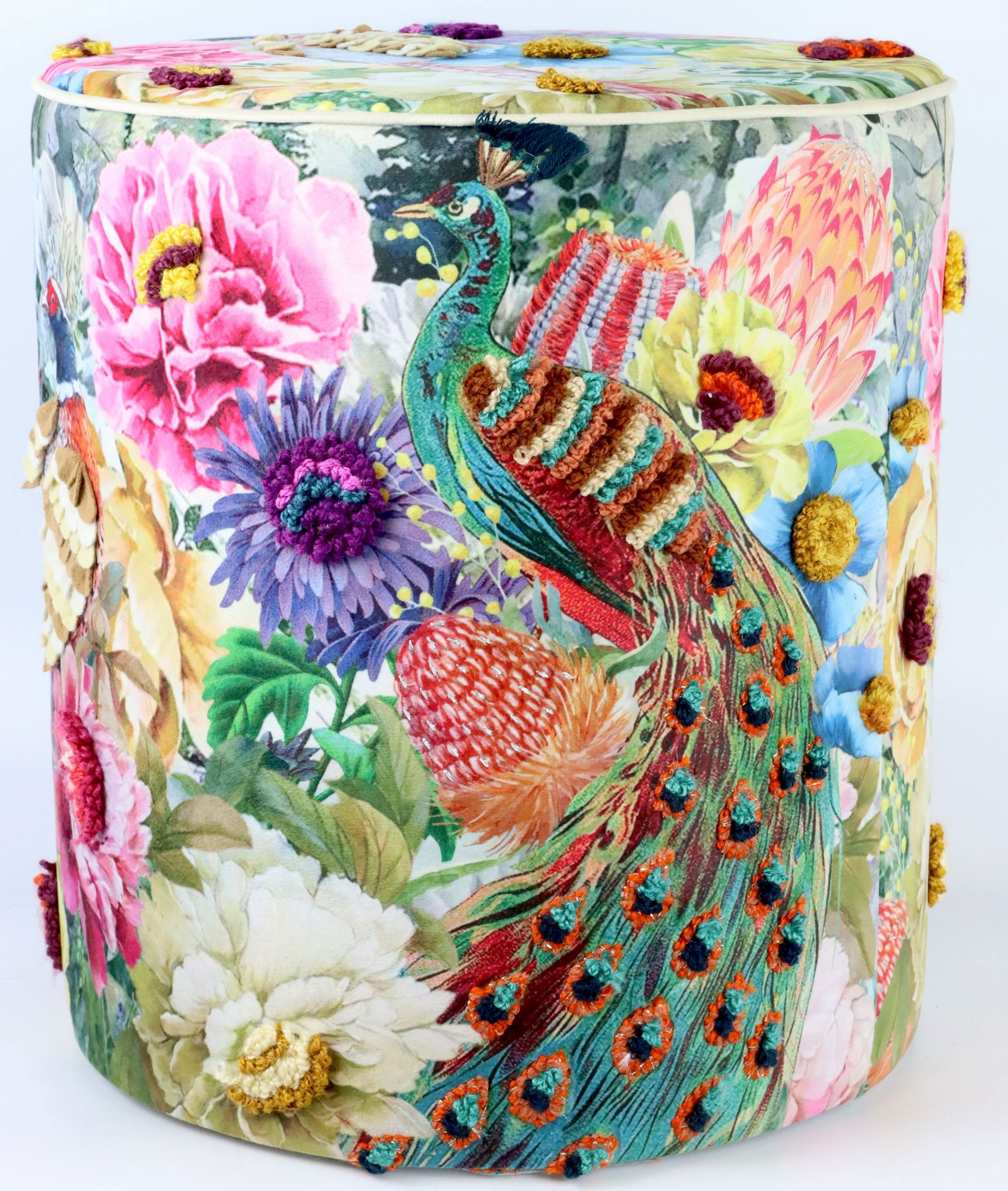 **Suchmaschinenrelevante Keywords:** Pouf Pfauenmotiv, Wohnaccessoires Frühjahr 2023, exklusiver Sitzhocker, trendy Wohndesign, Lifestyle Wohnen.