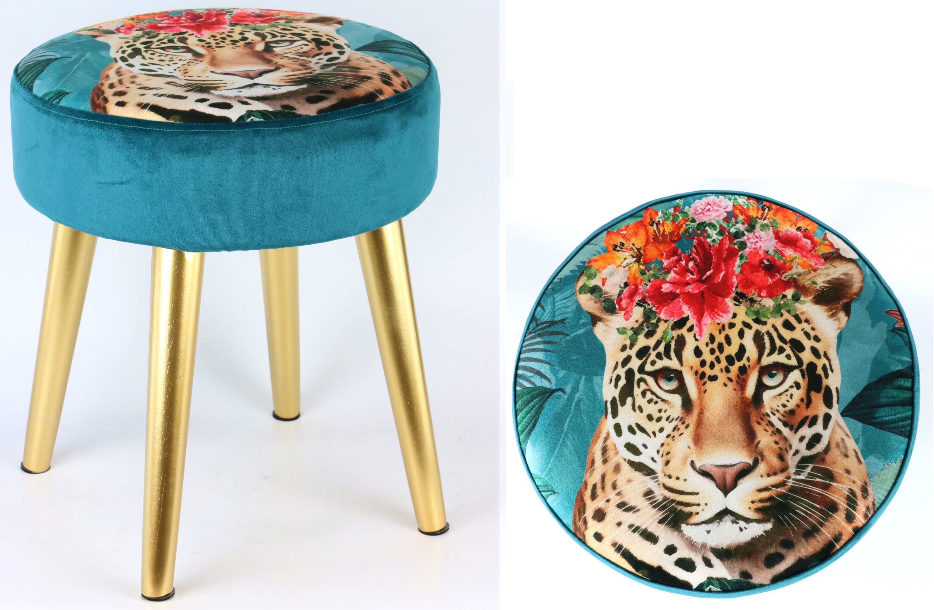 Mit einem Durchmesser von 40 cm fügt sich der Hocker ideal in jedes Wohnambiente ein und bietet eine vielseitige Ergänzung zu Sofas, Sesseln oder auch als eigenständiges Highlight in Ihrem Wohnbereich. Der Hocker ist ein echter Hingucker für die Frühjahrs- und Sommersaison und setzt mit seinem exotischen Leoparden-Design markante Akzente. Dadurch wird er nicht nur im Wohnzimmer, sondern auch im stilvoll eingerichteten Ladengeschäft zum einem Anziehungspunkt.