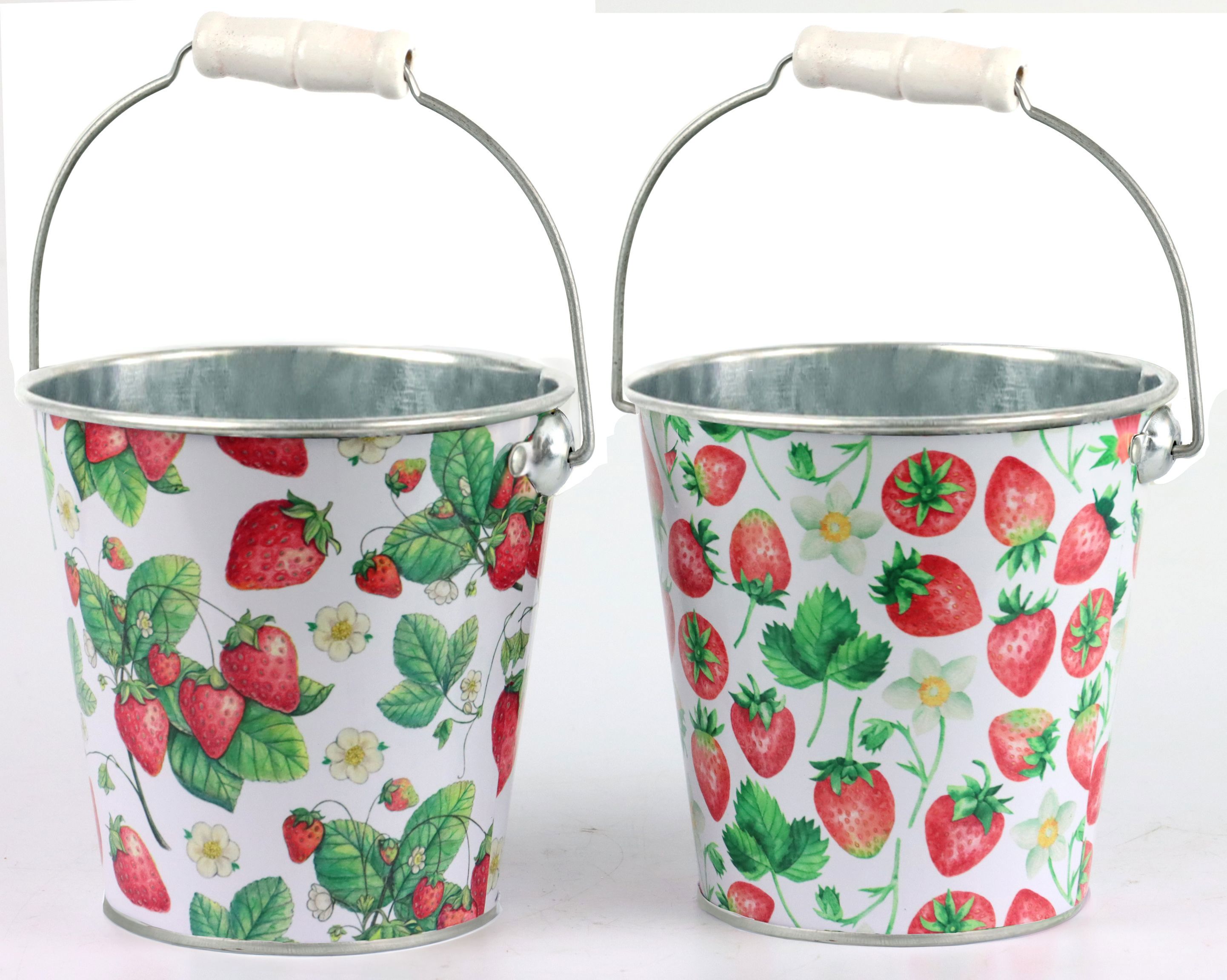 Unser Henkeleimer-Set wird aus hochwertigem Zink gefertigt, das nicht nur für seine Robustheit, sondern auch für seine ansprechende Optik geschätzt wird. Mit einem Durchmesser von etwa 12,5 cm sind diese Eimer perfekt proportioniert, um sowohl dekorativen als auch praktischen Zwecken zu dienen. Das verspielte Erdbeermuster fängt die lebendige Energie des Frühlings und Sommers ein und sorgt dafür, dass die Eimer in jedem Verkaufsraum zum Hingucker avancieren.