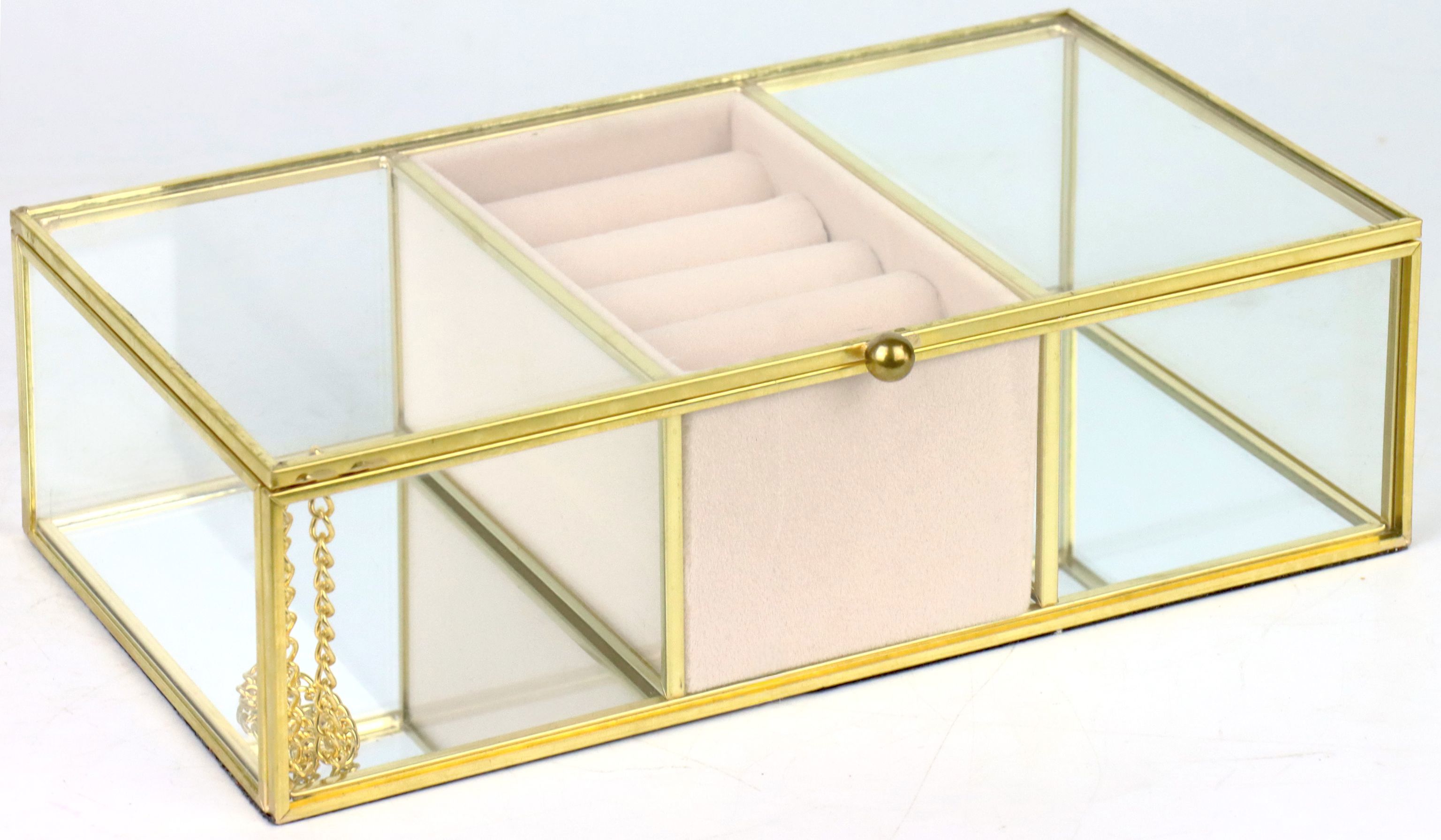 Das Design mit dem subtilen, aber auffälligen Goldrand verleiht der Schmuckschatulle eine zeitlose Eleganz, die sowohl zu klassischen als auch modernen Interieurs passt. Durch die Kombination von Transparenz und Goldoptik wirkt die Box besonders edel und ansprechend, was die Kaufbereitschaft Ihrer Kunden erhöhen kann.