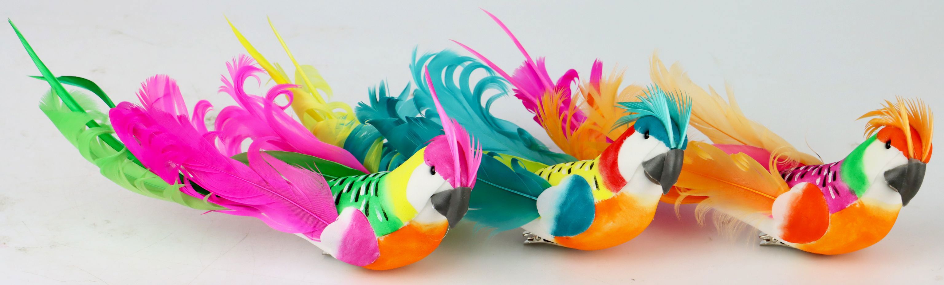 Die Papageienklammern bestehen aus hochwertigem Styropor und sind mit detailgetreuen Kunstfedern verziert, um ein lebensechtes und farbenfrohes Design zu gewährleisten. Jeder Papagei misst ca. 19 cm und ist mit einer Metallklammer ausgestattet, die eine einfache und flexible Befestigung ermöglicht. Diese Eigenschaften machen die Klammern vielseitig einsetzbar, sei es zur Verschönerung von Pflanzen, Vorhängen oder Ladentheken.