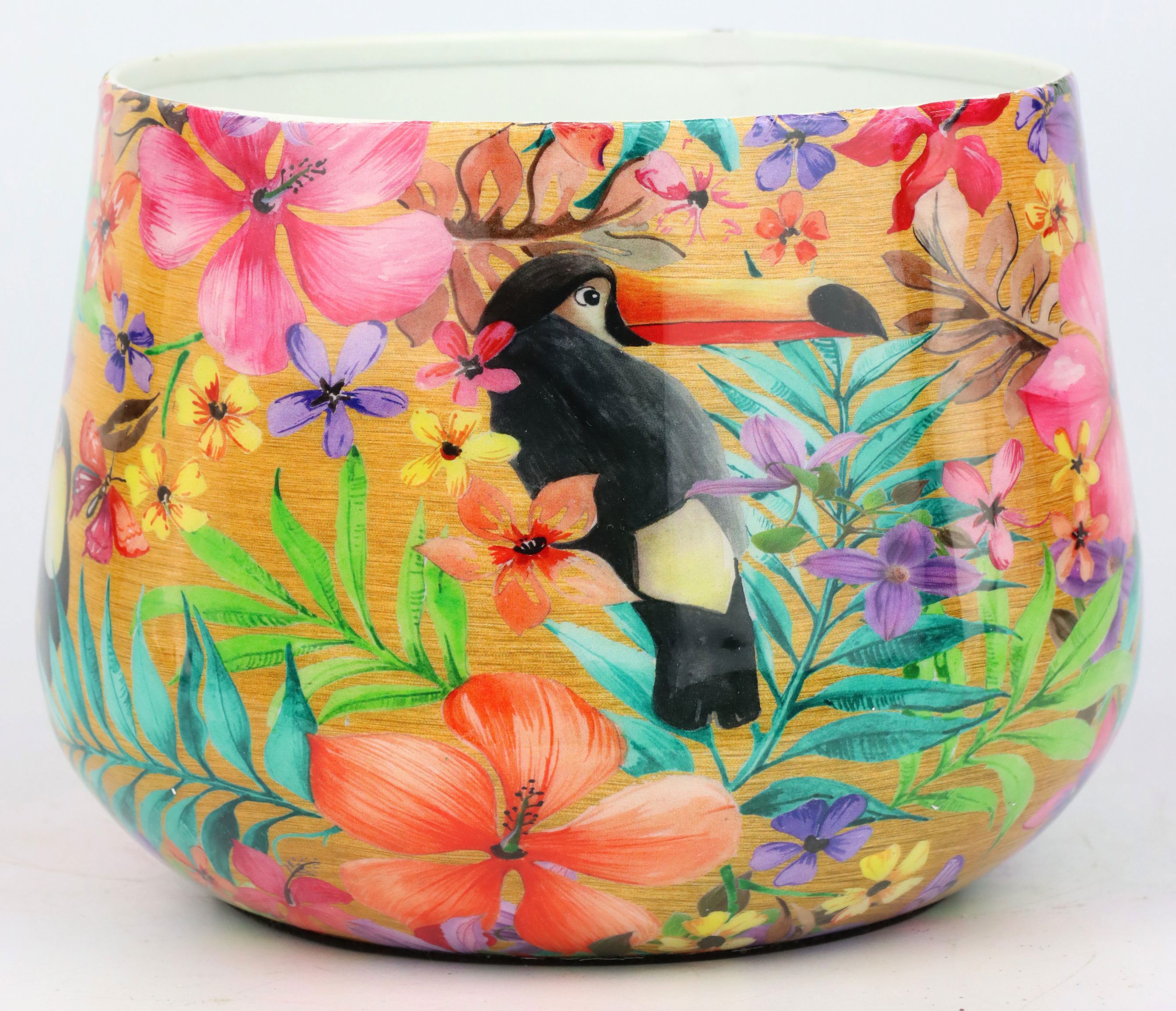 Mit einem Durchmesser von etwa 15 cm bietet dieser Übertopf genügend Platz, um Ihre Lieblingspflanzen stilvoll zu präsentieren. Die aufwendige Gestaltung zeigt ein Motiv eines Paradiesvogels, das jedem Raum einen Hauch von Exotik und Lebendigkeit verleiht. Die eleganten Farben und das detailreiche Design sprechen Kunden an, die nach einem auffälligen und dennoch stilvollen Dekorationsstück suchen.