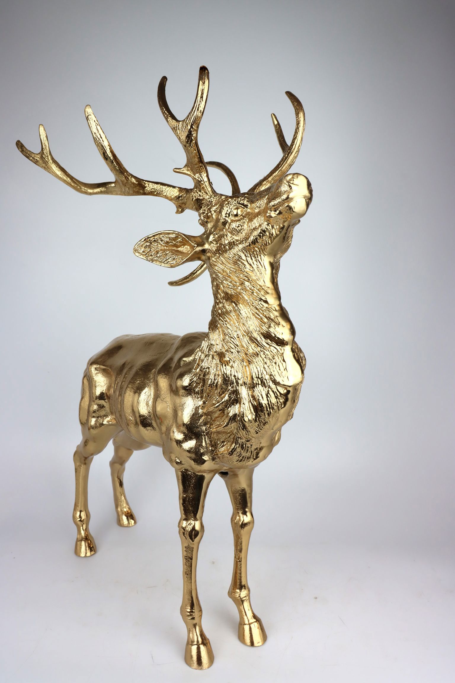 Der Hirsch "Golden Majesty" vereint künstlerische Handwerkskunst mit modernen Design-Elementen. Das hochwertig verarbeitete Aluminium glänzt in edlem Gold und fügt sich nahtlos in jedes stilvolle Wohnambiente ein. Ob im Wohnzimmer, Eingangsbereich oder sogar in Schaufenstern als Blickfang – dieser goldene Hirsch ist ein Zeichen von Luxus und Geschmack, das Ihre Kunden begeistern wird.