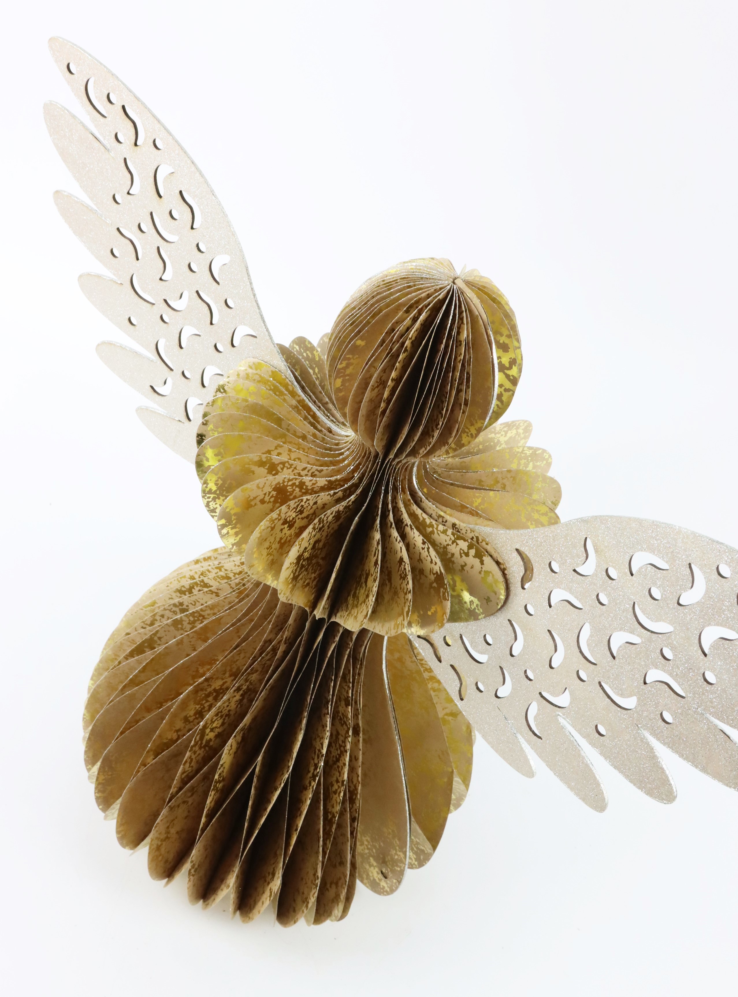 - Beschaffenheit: Faltbarer Dekoengel in Gold mit silbernen Flügeln aus Papier