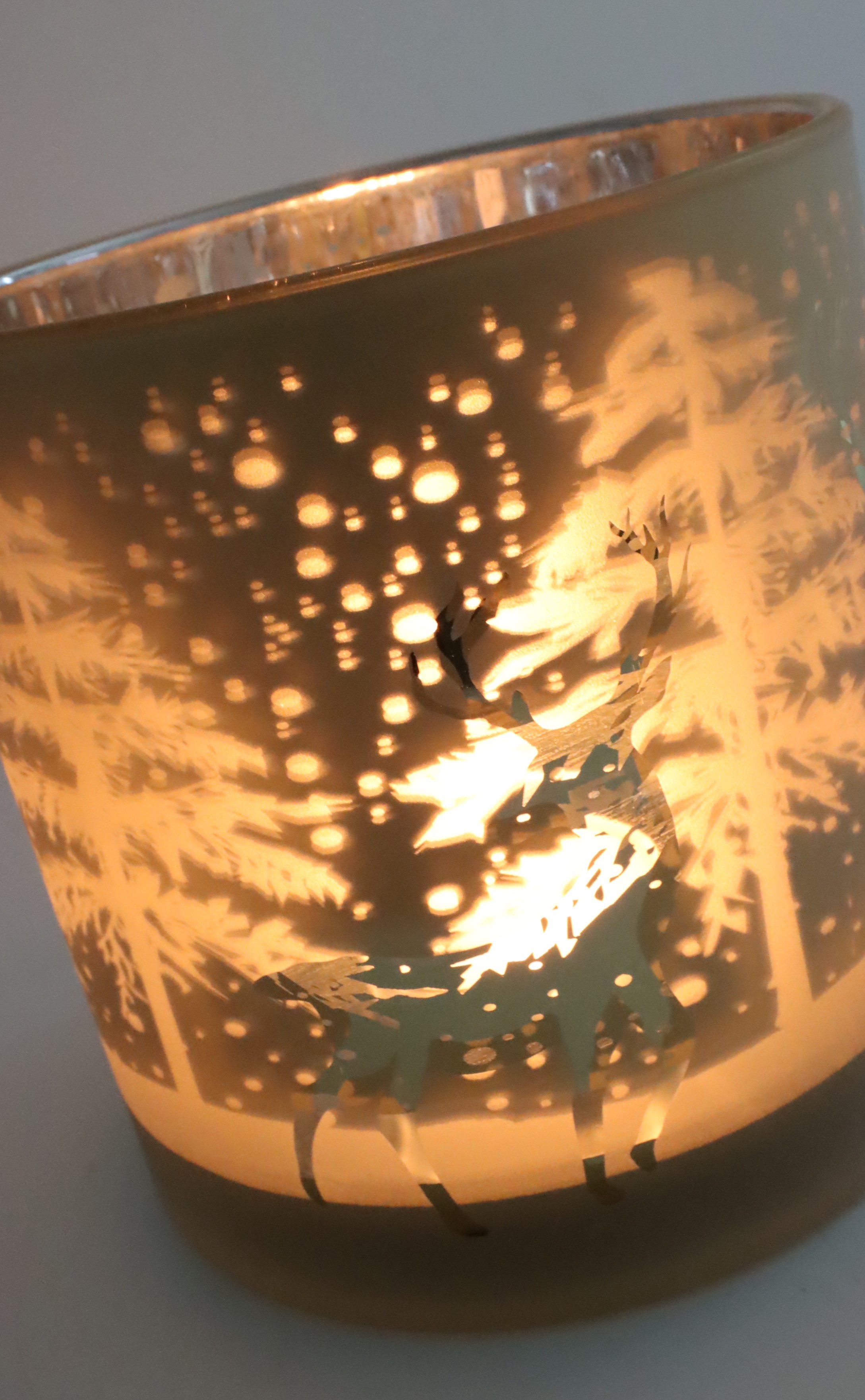 Das Windlicht "Winterszene" ist eine bezaubernde Ergänzung für das festliche Sortiment jedes Einzelhändlers im Bereich Wohnen und Lifestyle. Der glänzende Goldton passend zur Weihnachtszeit sorgt für eine warme, behagliche Atmosphäre und die ausgeschnittene Winterszene mit Hirsch und Tanne verleiht jedem Raum instantan einen Hauch von winterlichem Charme. Stellen Sie dieses Windlicht auf den Tisch, ins Regal oder auf die Fensterbank und lassen Sie die Flamme des Teelichts durch die filigranen Aussparungen leuchten. So erzeugt das Windlicht ein wundervolles, beruhigendes Lichtspiel und sorgt für eine besondere Feststimmung.