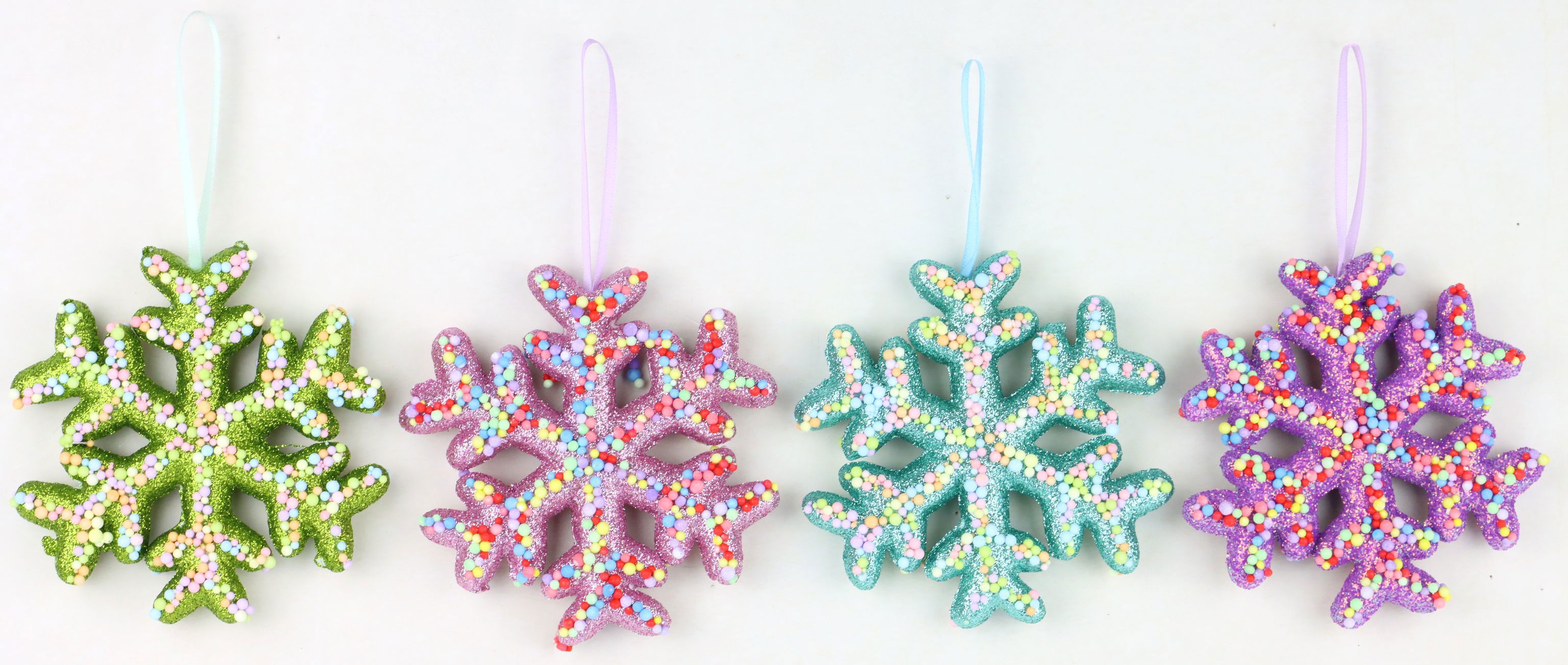SEO-relevante Keywords: Weihnachtsbaumschmuck, Schneeflocken, Weihnachtsdeko, Wohnen und Lifestyle, saisonale Dekoration, Dekoprodukte, Styropor Kunststoff, Glitter-Oberfläche, Candy Farben, "SNOWFLAKES"JOLLY XMAS" S/4.