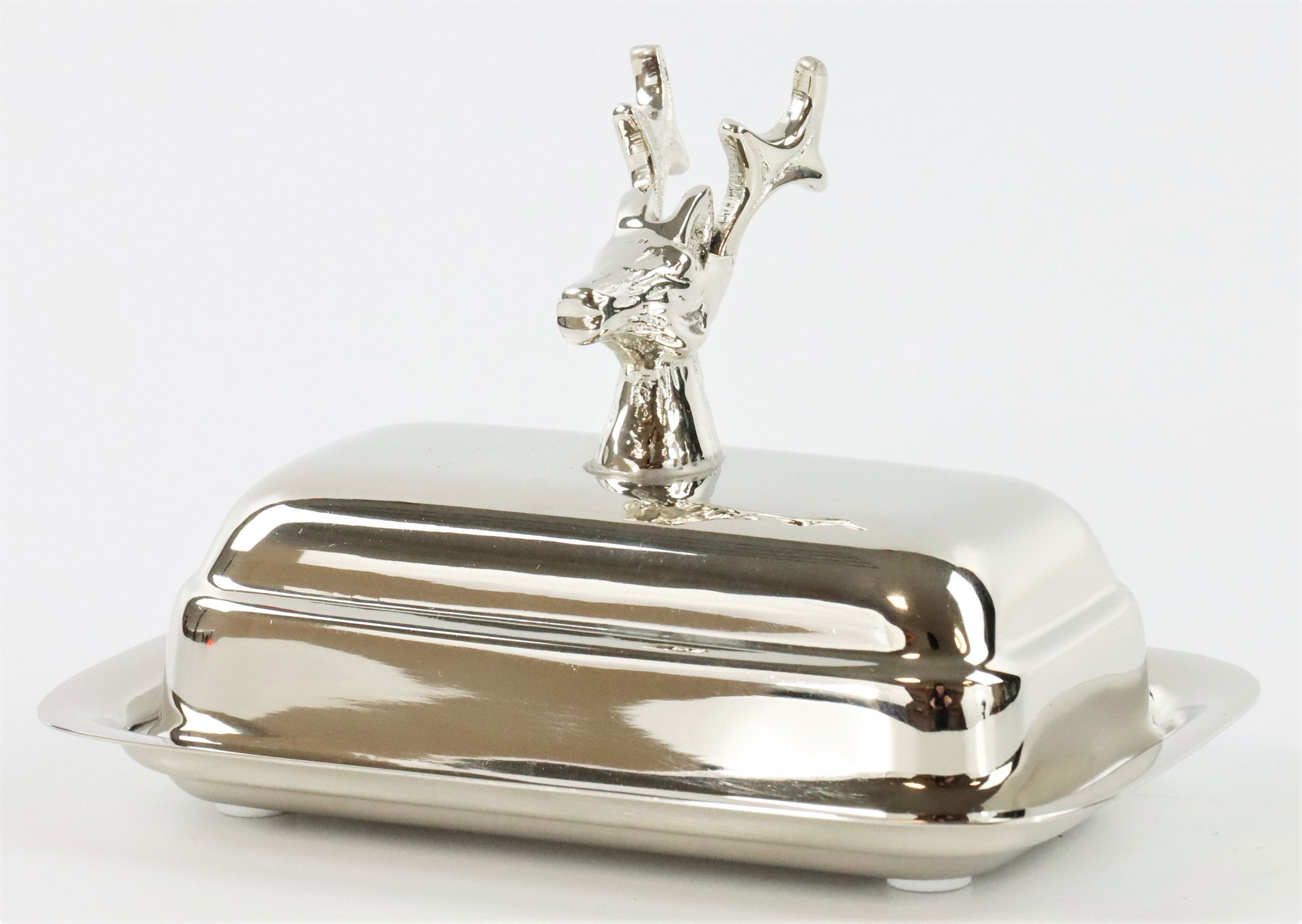 Diese BUTTERDOSE "HIRSCH", aus bestem Stainless Steel gefertigt und schön vernickelt, bietet einen unvergleichlichen Stil und erstklassige Leistung auf einmal. Die vernickelte Oberfläche sorgt für eine nahtlose Ästhetik, bezaubert aber auch durch ihren zusätzlichen Korrosionsschutz. Die Größe von ca. 14,5cm ist ideal, um Standardbutterblöcke unterzubringen und sie frisch zu halten.