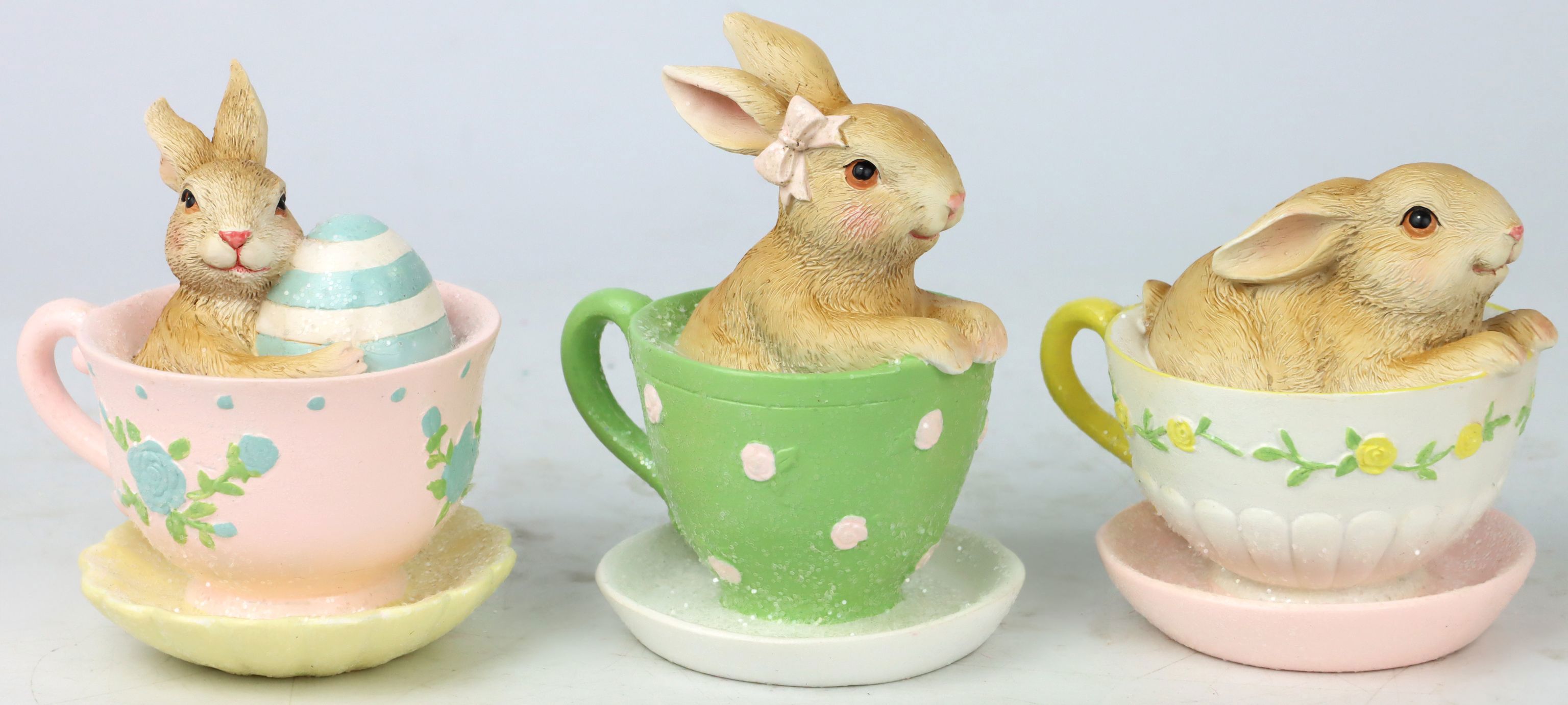 - **3-teiliges Hasentrio**: Niedliche Hasenfiguren, die in Tassen sitzen, bringen eine verspielte Note in Ihre Osterkollektion.
