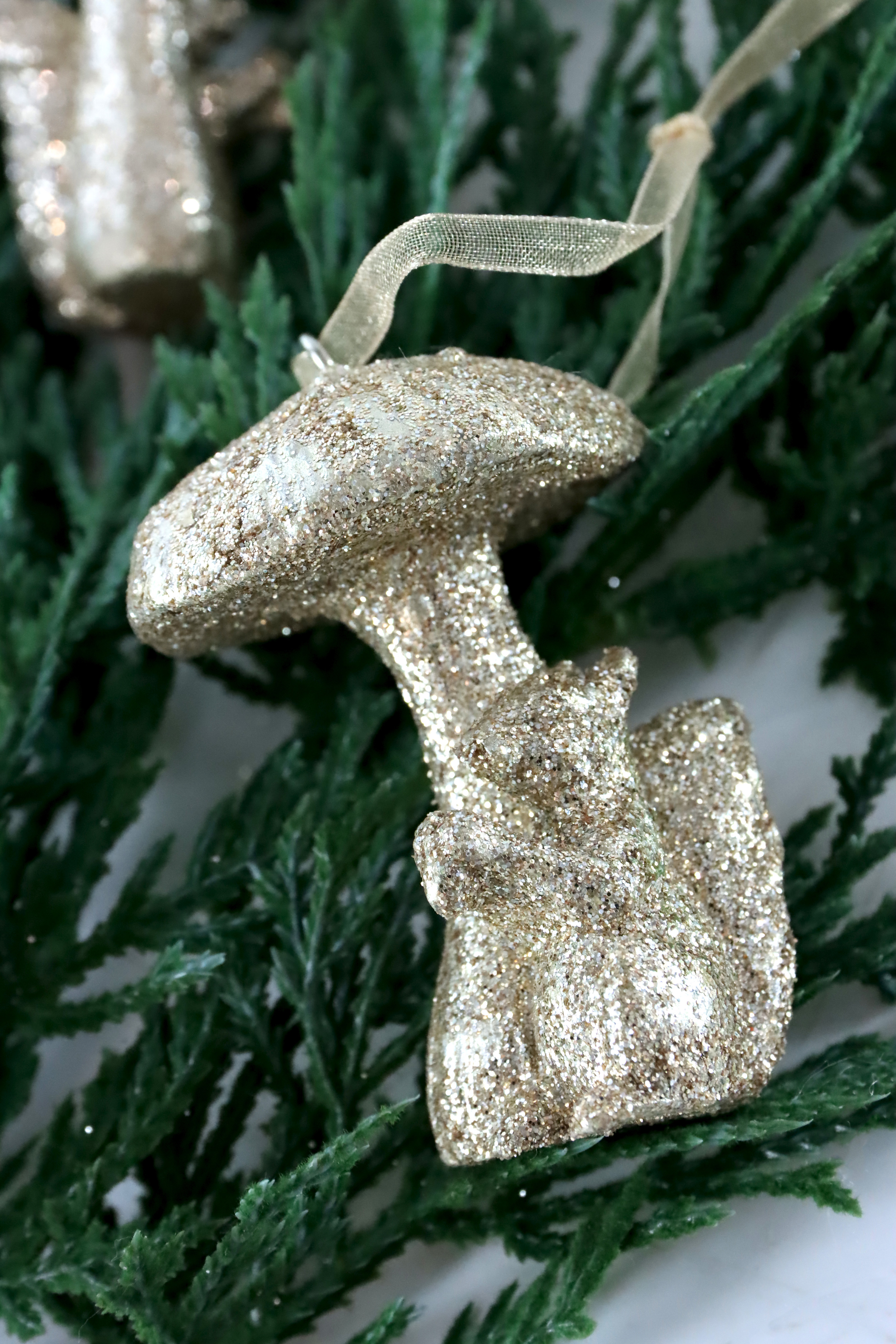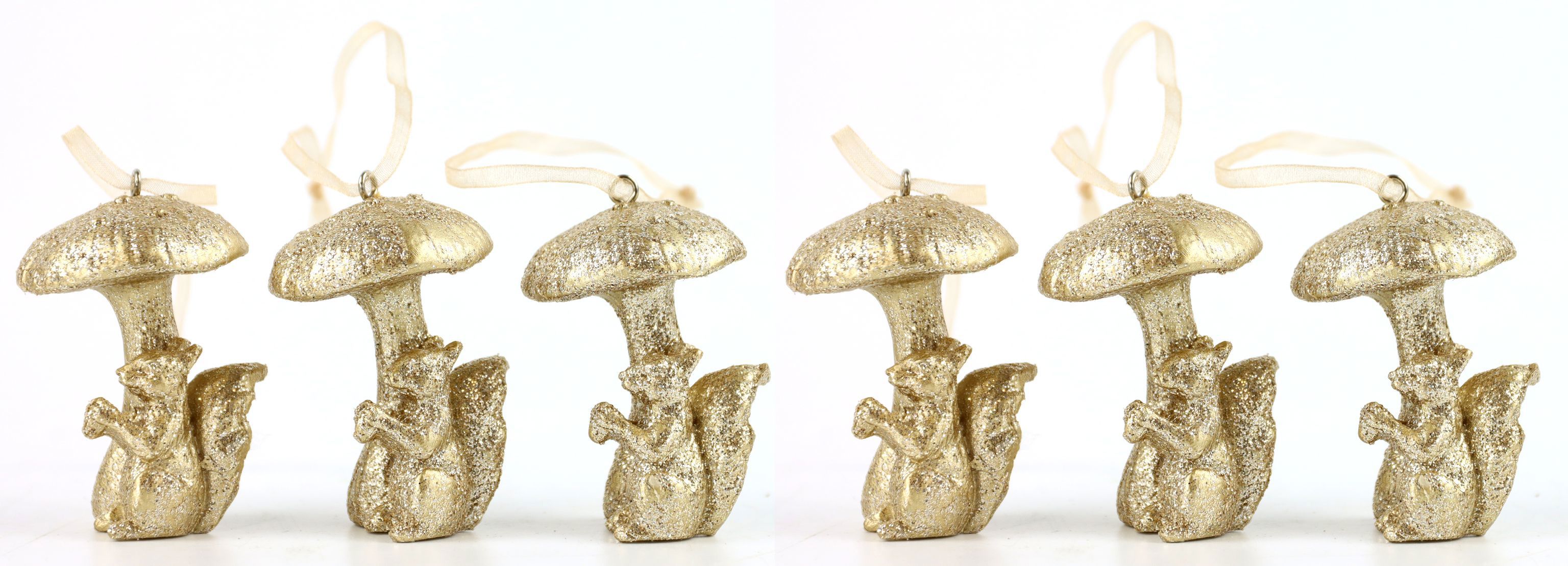 - Set bestehend aus 6 Zierhängern in Form von goldenen Pilzen mit Eichhörnchen