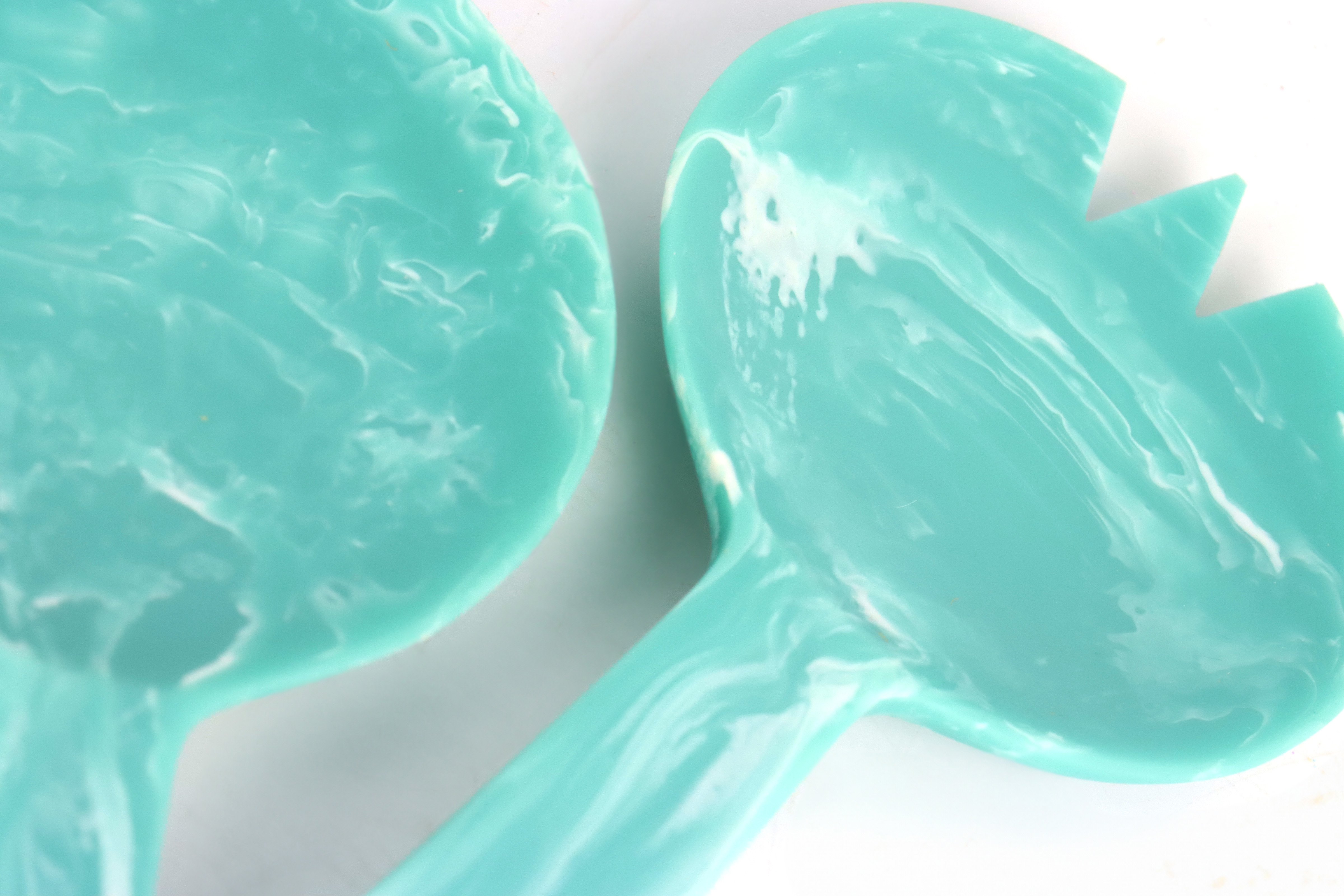 Made from robust resin, the salad servers combine durability and lightness. The turquoise colour is not only a symbol of freshness and vibrancy, but also brings a touch of spring and summer to the table. The unusual alabaster design emphasises the value and gives the set a special, modern touch.