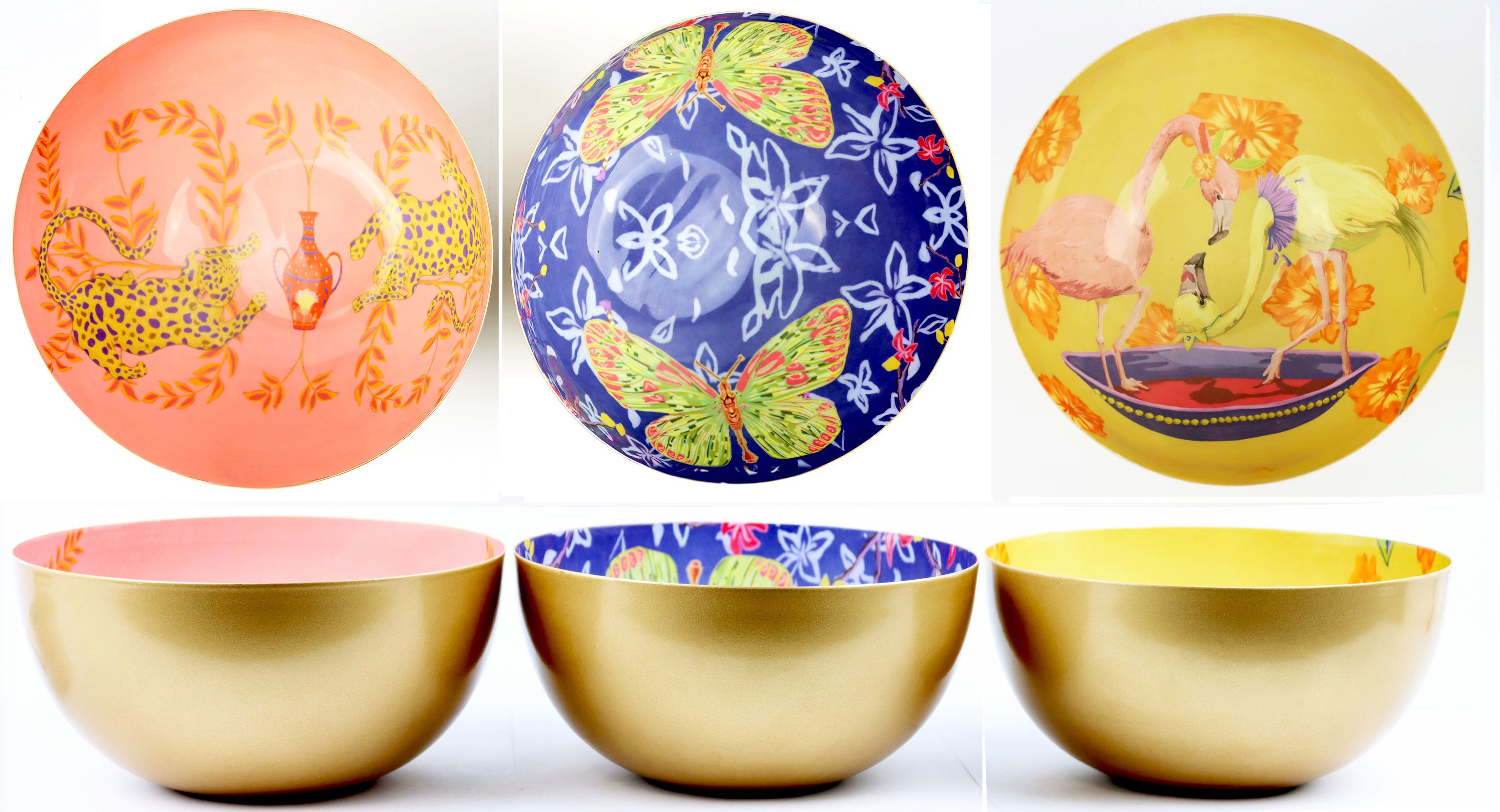 The "Asian Fauna" bowl set, consisting of three artistically designed bowls, impresses with its harmonious colour scheme in coral, blue and yellow, complemented by elegant golden accents. Made from high-quality metal, this set not only offers an attractive look, but also durability and robustness - ideal for everyday use or special occasions.