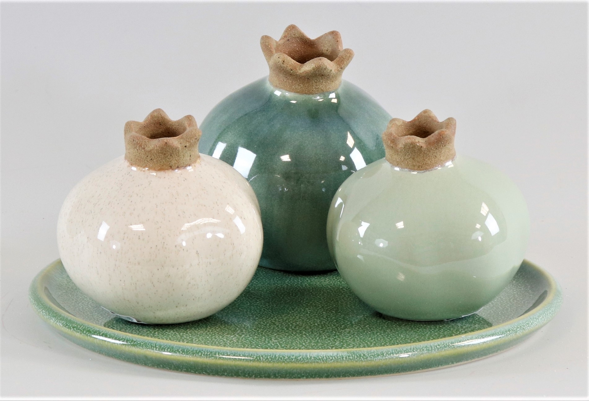 - Contains two vases measuring 8 cm and 11 cm in height and a 21 cm diameter plate