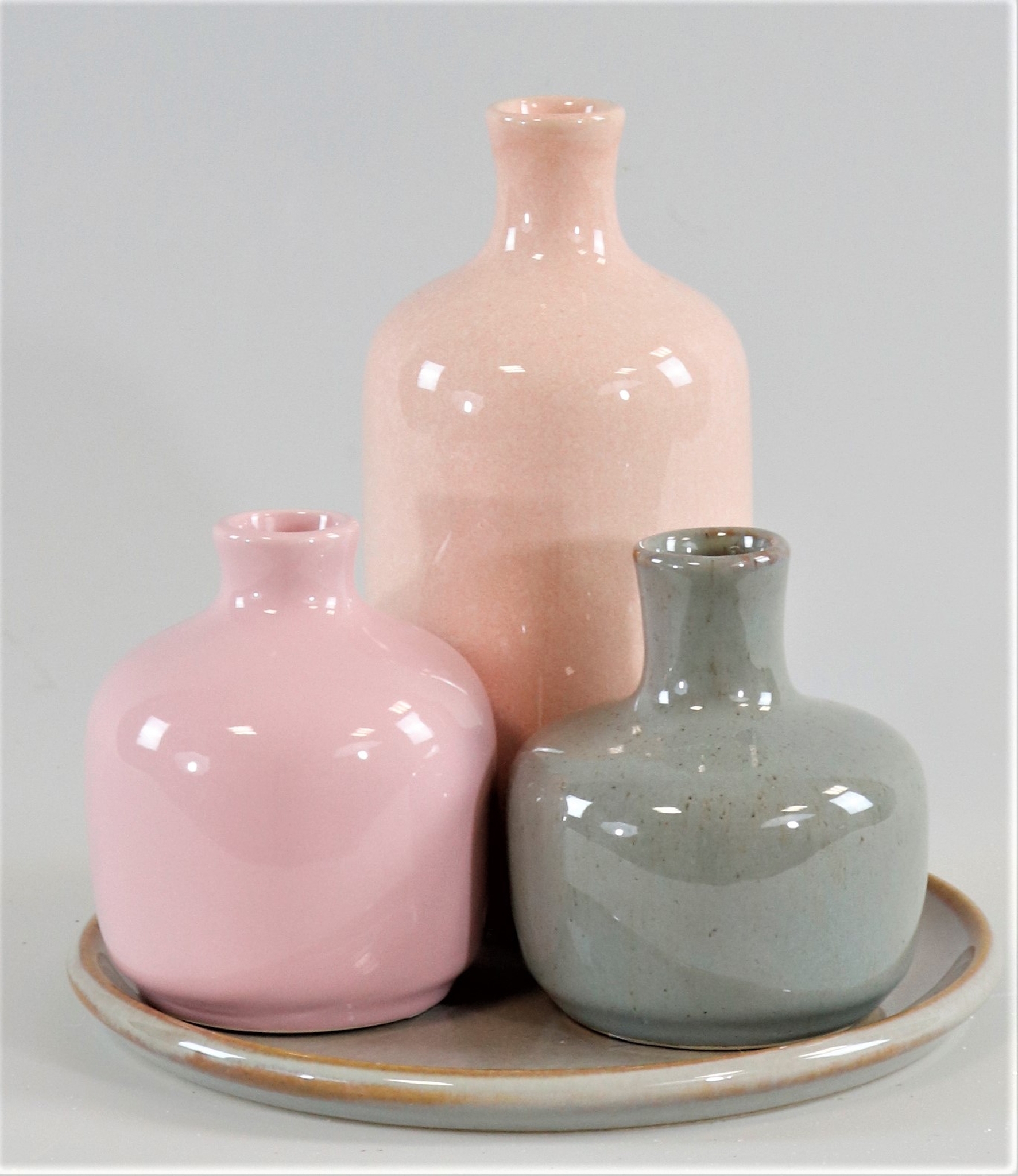 This set is not just a decoration, it is an expression of style and sophistication. Place the vases on the plate to create a harmonious overall composition or distribute the vases individually in your sales area to visually enhance different areas. Customers will appreciate the aesthetic versatility and timeless elegance of these vases.